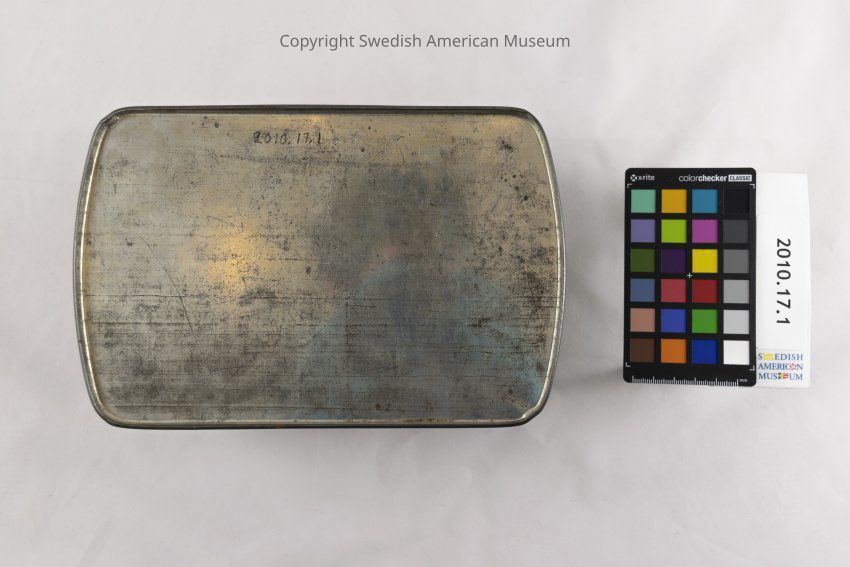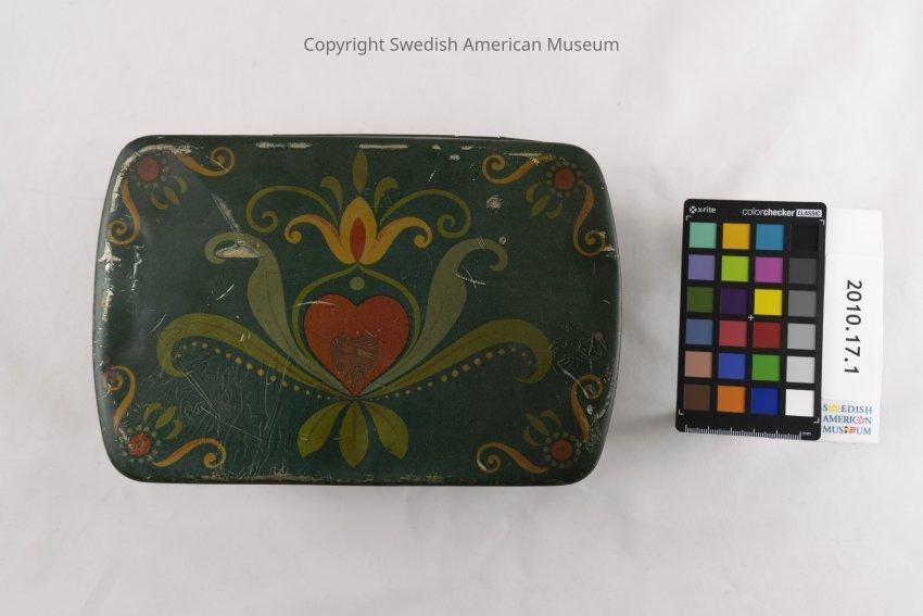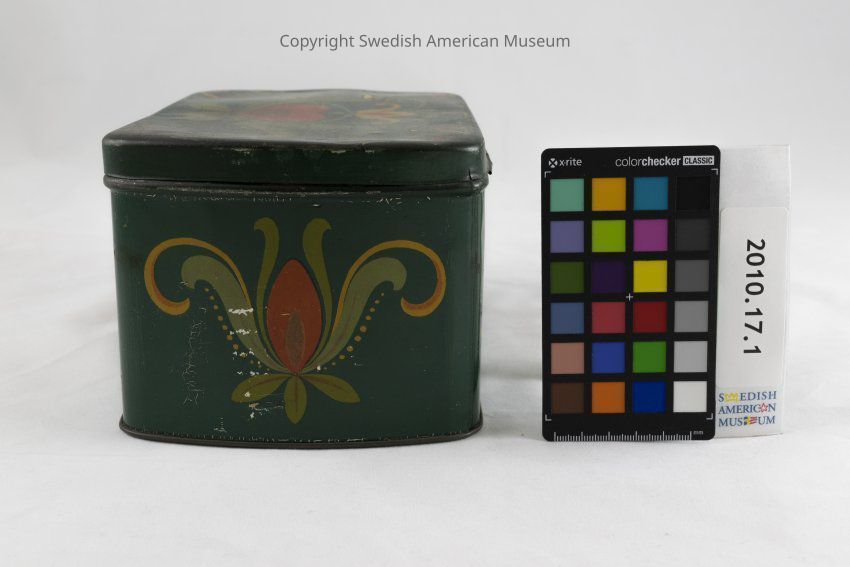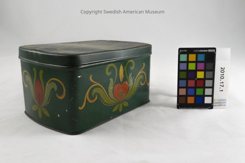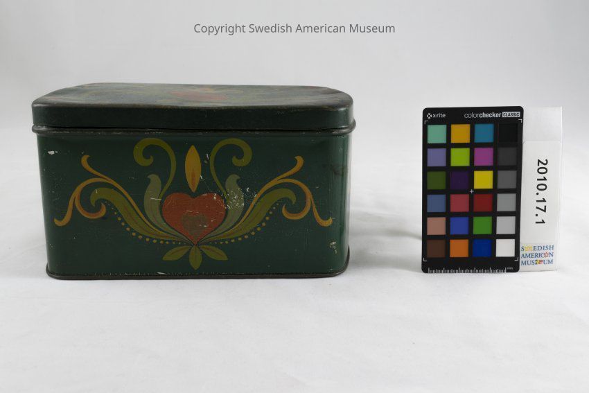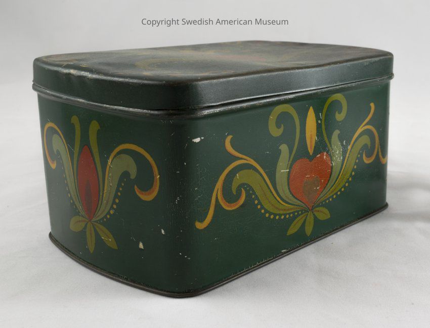 Pine green Swedish tin box with a painted folk motif. The artwork in the motif includes five larger red flowers, three of which are heart-shaped and two of which are leaf-shaped, four medium-sized red flowers, the latter of which are surrounded by green dots. All five of the larger flowers are attached to green leaves, most of which are large and winding while about half of the large and winding leaves are connected with yellow or green musical bass clefs, half of which are mirror image and about half of the large and winding leaves are immediately adjacent to rows of yellow dots. All of the medium-sized red flowers are connected with three green leaves and two yellow musical bass clefs, half of which are mirror image while each of the three red heart-shaped flowers has a yellow top, two of which are leaf-shaped and one of which is tulip-shaped.Acquisition