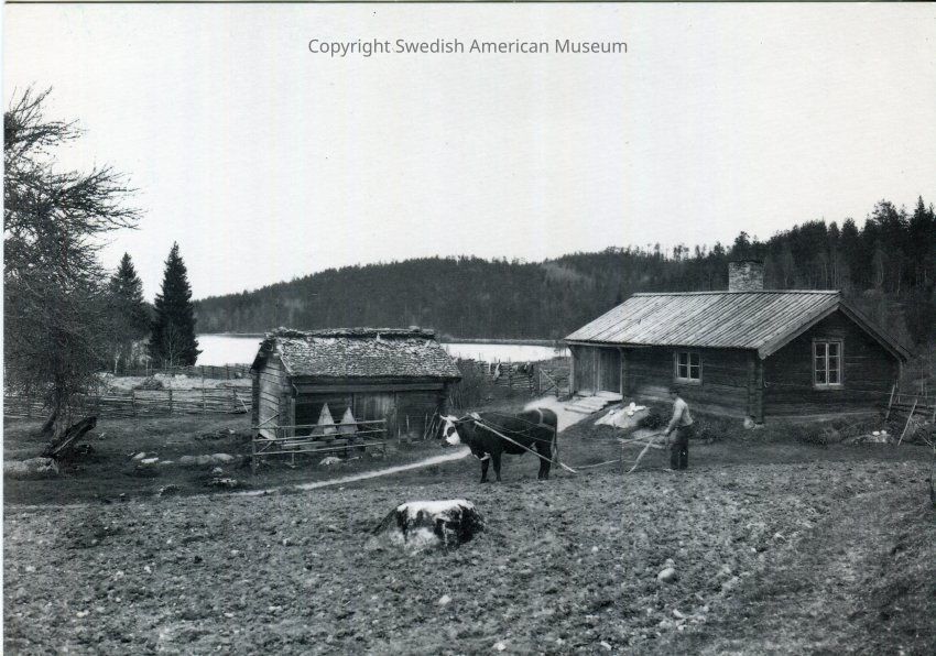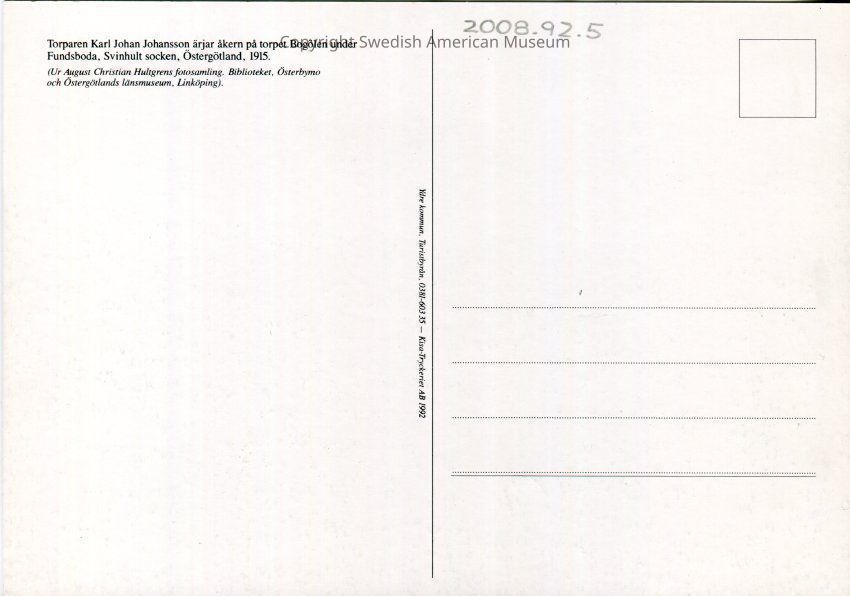 This is a postcard that shows a country scene in Sweden's province of Östergotland during 1915. The scene includes a house that's composed of horizontal wooden bars with a slanted roof that's composed of vertical wooden bars, a toolshed-like house that's composed of horizontal wooden bars and a slanted sheathed roof, a man who appears to be tending to a cow or steer, lots of grassland, two evergreen trees, a river and a densely forested area immediately adjacent to the latter. On the back of the postcard, the inscription, 'Torparen Karl Johan Johansson ärjar åkern på Torpet Bogölen under Fundsboda, Svinhult Socken, Östergotland, 1915.' is written on a white background in black letters.Acquisition