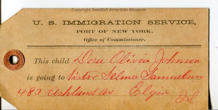 Dora Olivia Johnson who immigrated to the United States as a minor. The address of her destination is listed on the card in case she got lost and needed help finding her way.Acquisition