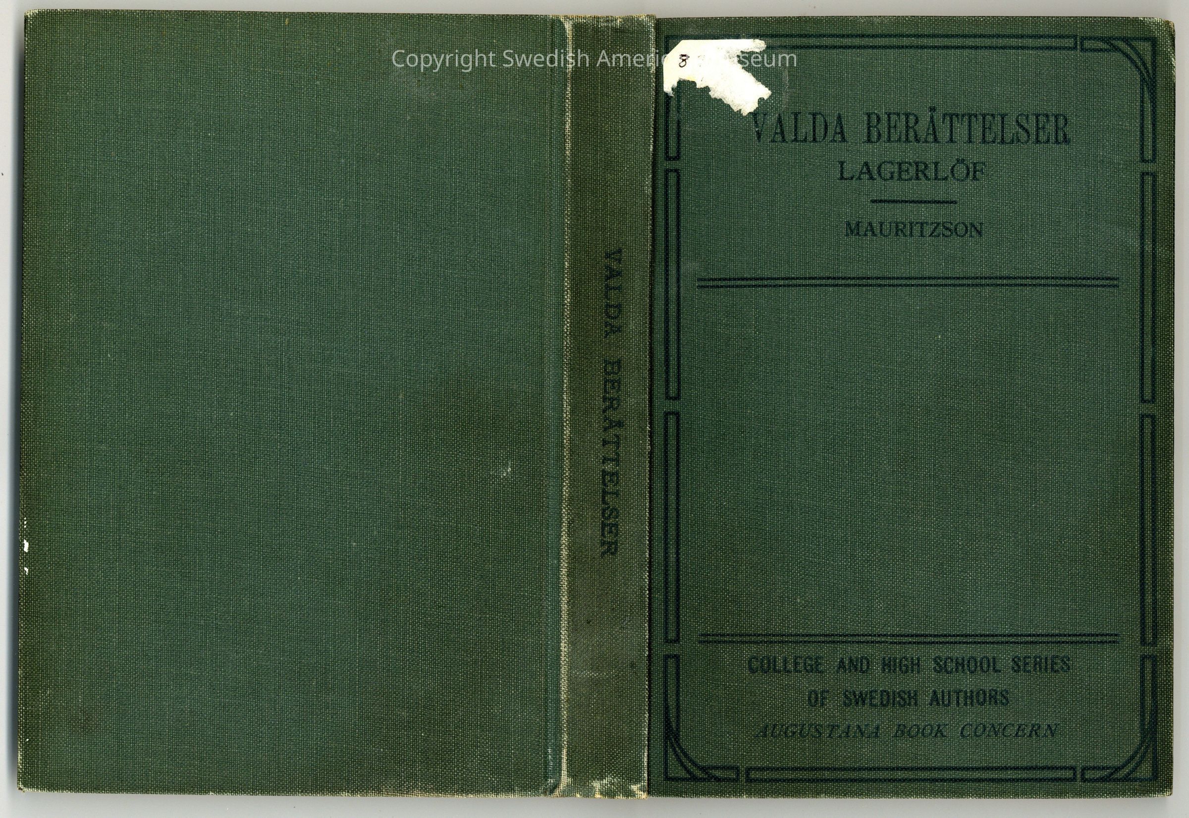 A green book containing five short stories written by Selma Lagerlöf and edited by Jules Mauritzson. The book is assumed to have been used as a teaching aid for individuals learning Swedish as the contents of the book include a vocabulary section in which Swedish words are translated to English. Inside the front cover is a logo for the Augustana College & Theological Seminary's Denkmann Memorial Library. A small slip of paper left in the book has seven different monograms of the letters "LTC."