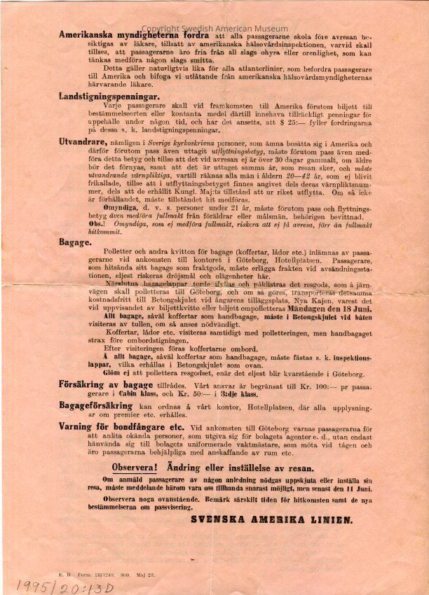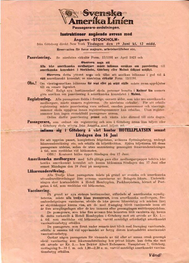 Travel instructions about registration, health certificate, and vaccinations printed by the Swedish American Line in Swedish.Context