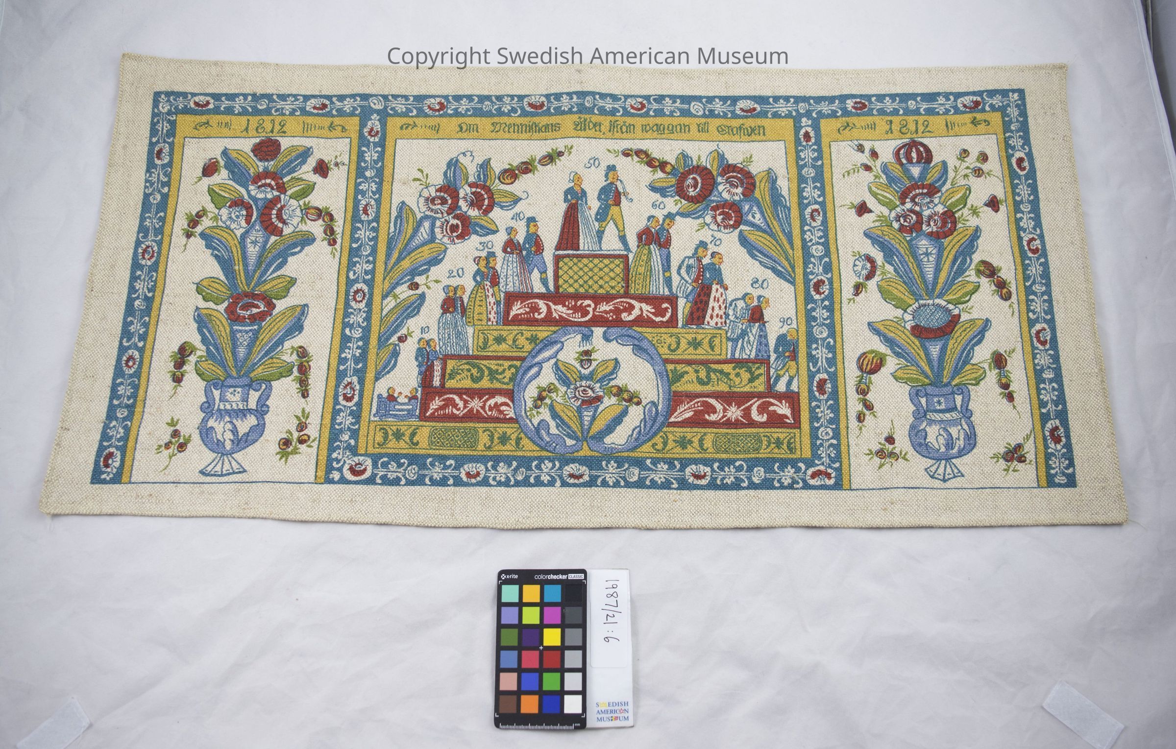 Hand-woven and hand-colored linen wall hanging. Traditional dalmålning motif of the ascent and descent of the ages of man in pictorial form, the so called “Ålderstrappan”. The inscription, “Om Människans åldrar ifrån vaggan till graven, 1812.” is in the front.Acquisition
