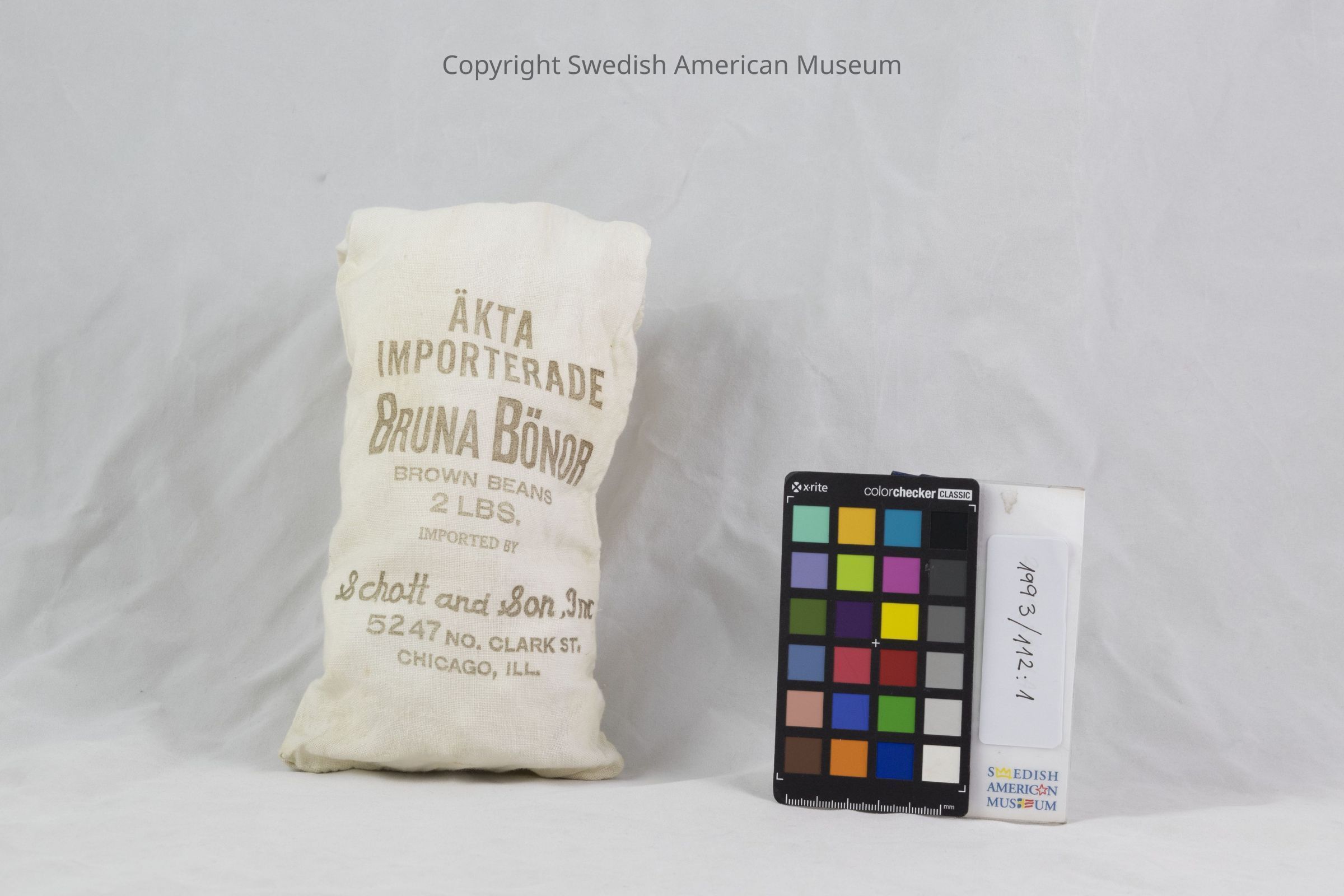 Cotton bag from Sweden. It holds two pounds of brown beans. Text printed on bag reads "Äkta Importerade Bruna Bönor; Brown Beans 2 lbs; Imported by Schott and Son, Inc. 5247 No, Clark Street, Chicago, IL".Acquisition