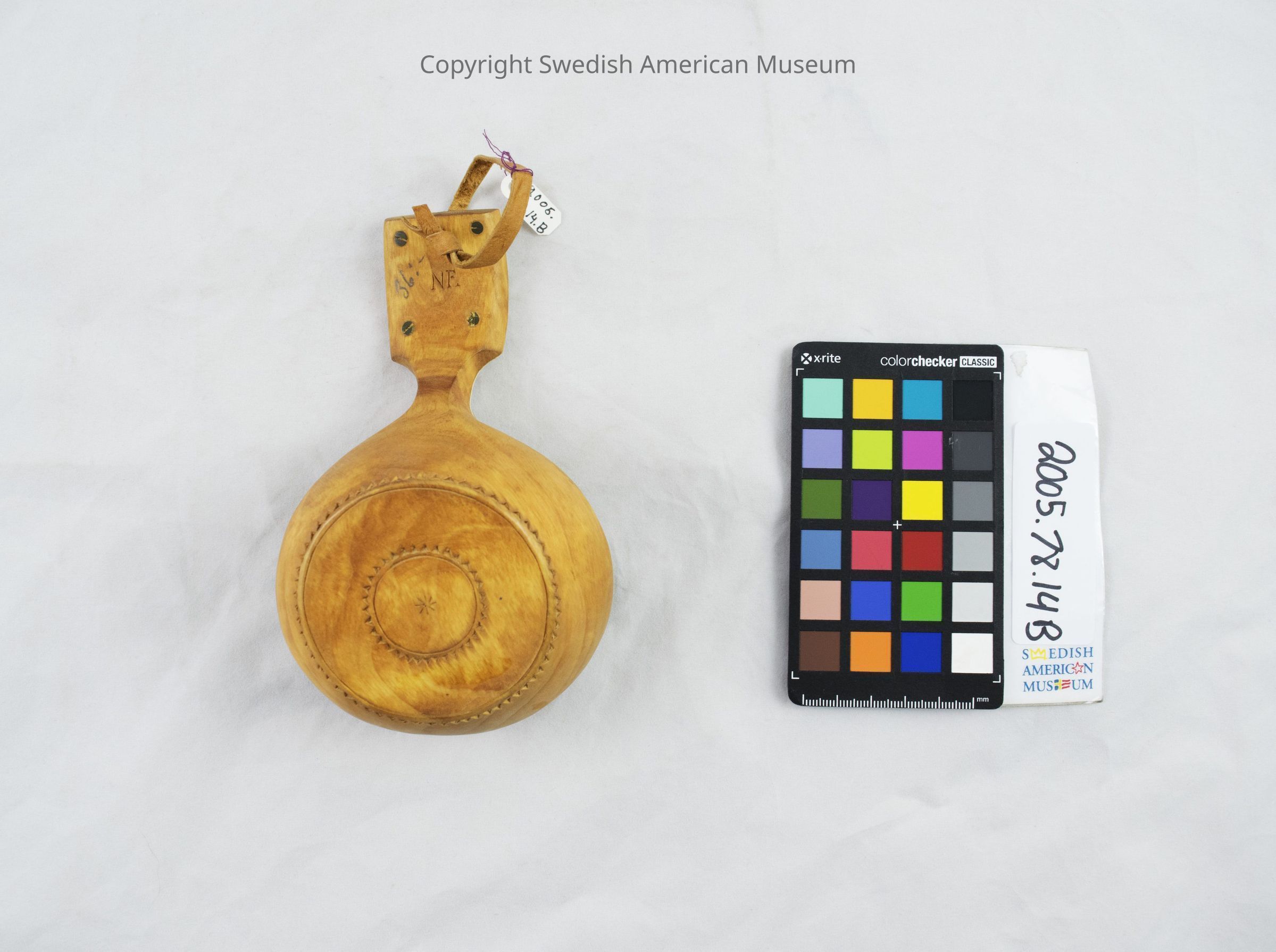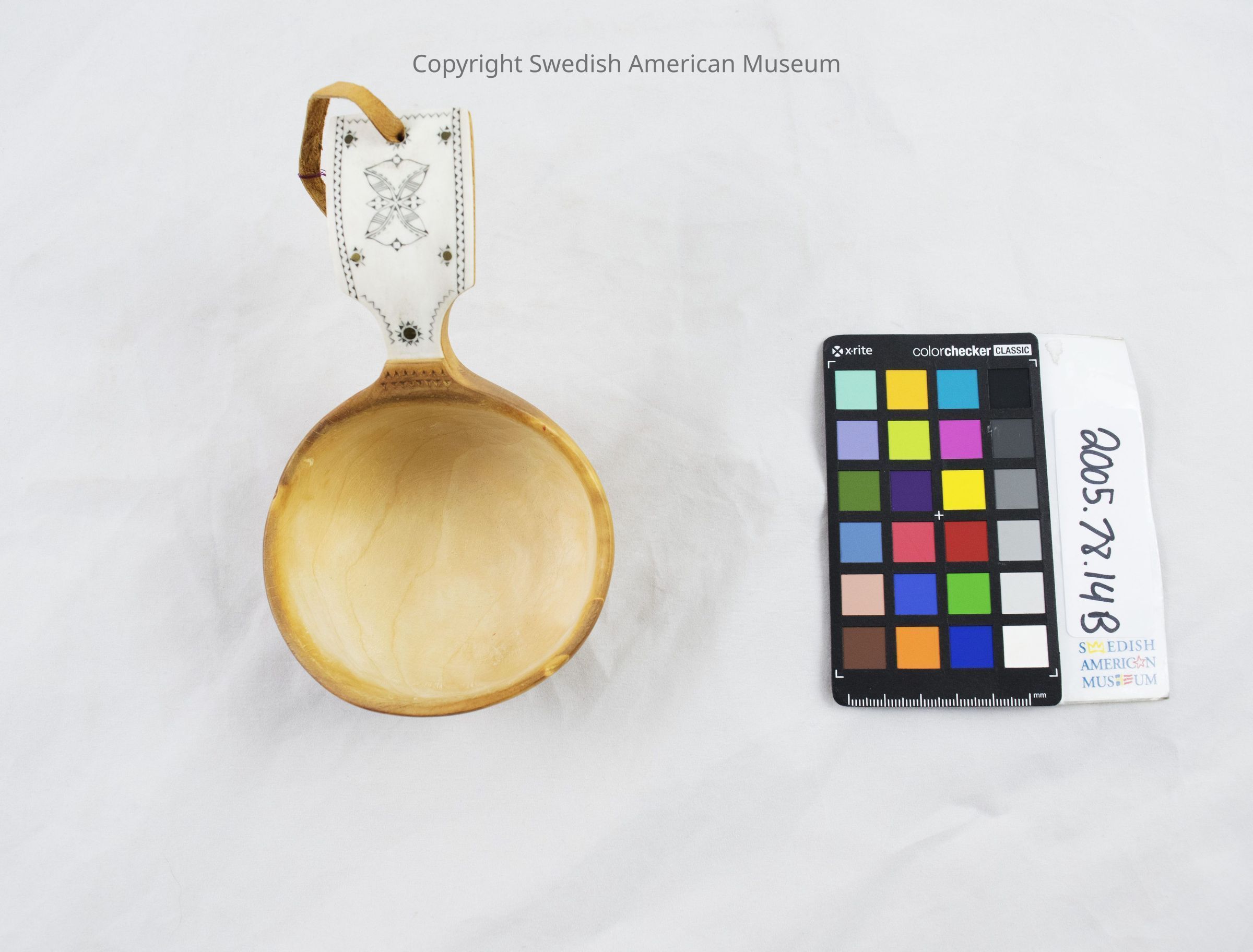 A Sámi guksi made of wood. The upper part of the handle is white, made of reindeer antler, and decorated. A leather strap is attached to the handle.Context