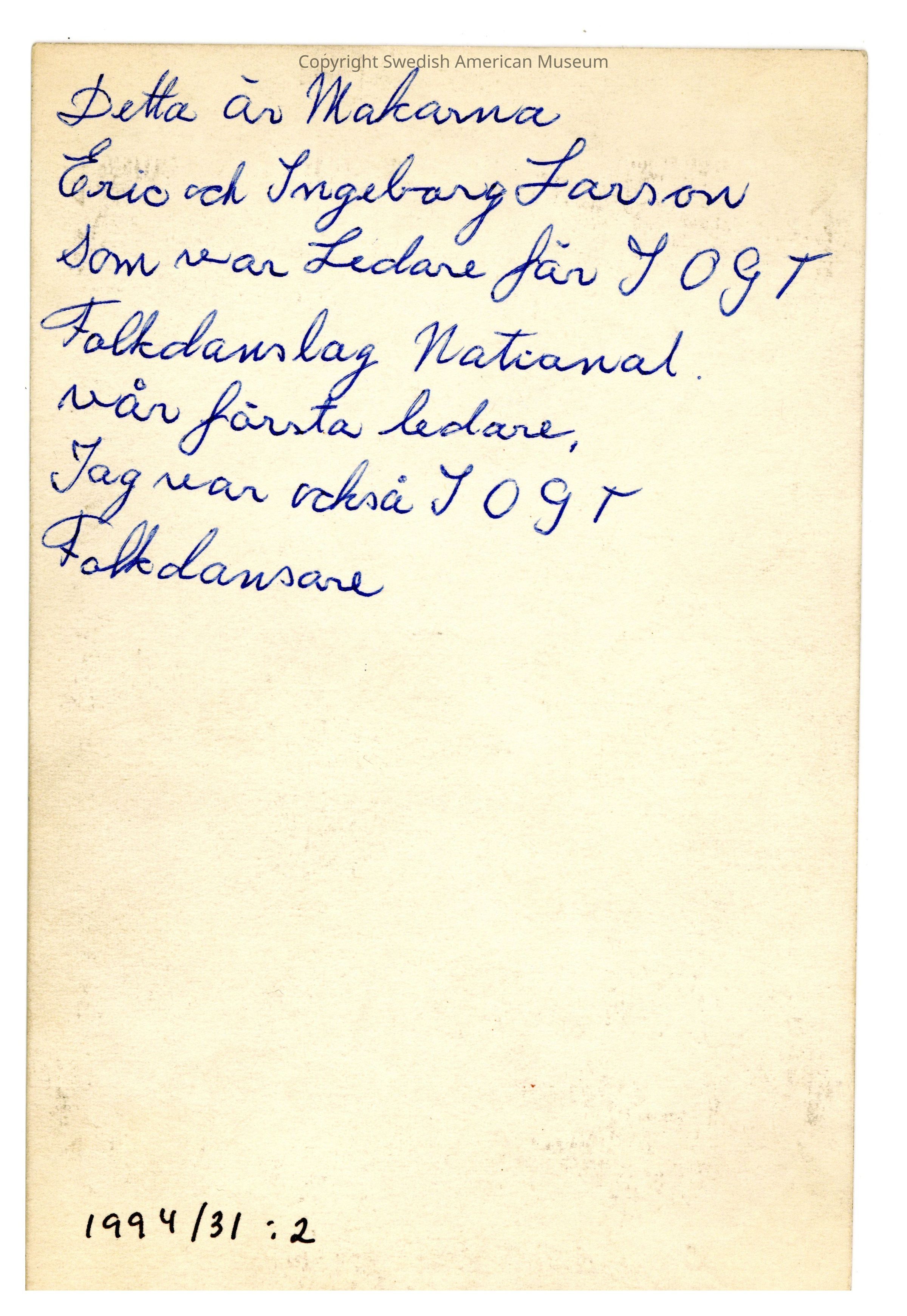 This is the married couple Eric and Ingeborg Larson who were leaders for the National IOGT folk dancing group, our first leaders. I was also an IOGT folk dancer