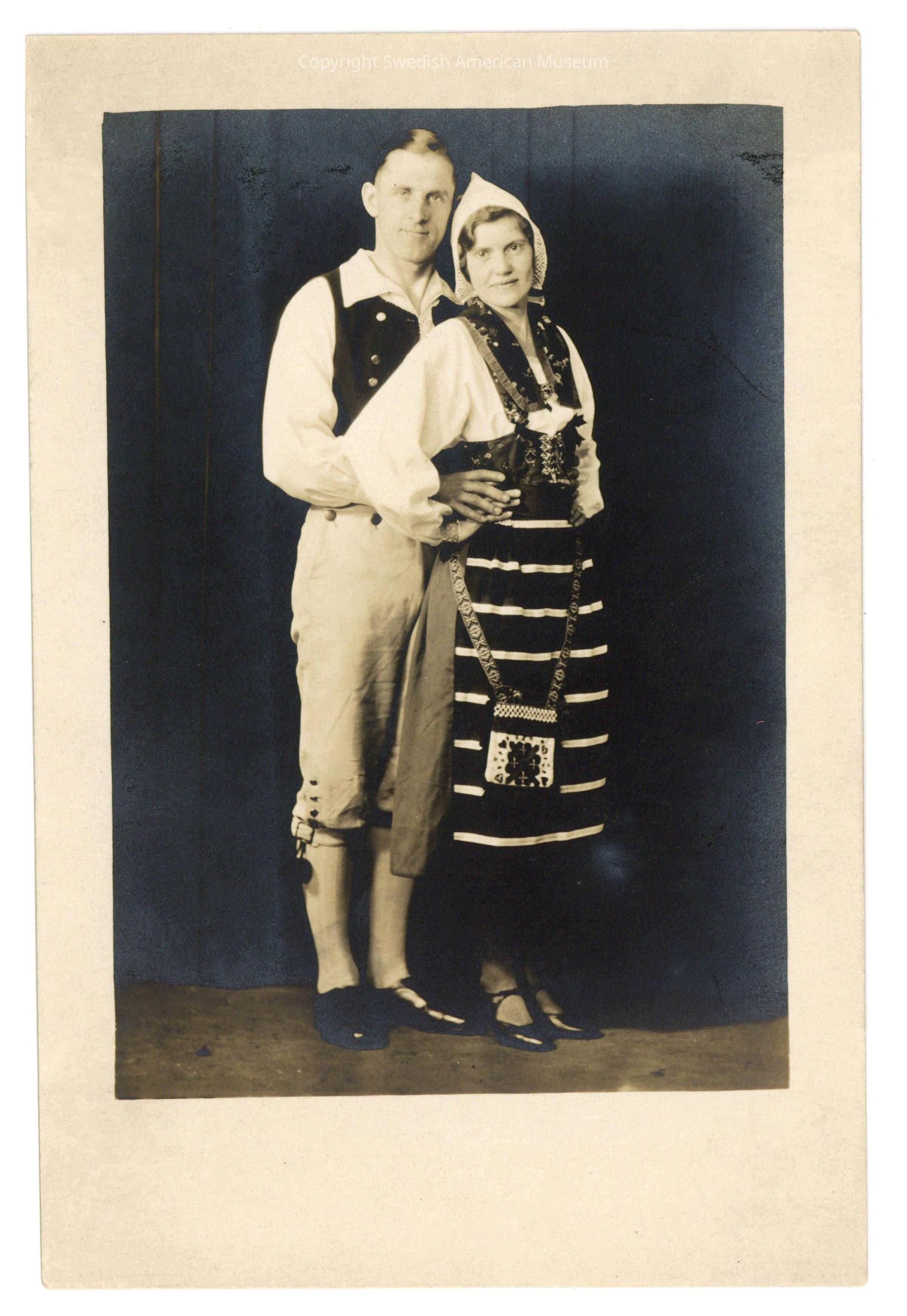 Black-and-white photograph of Eric and Ingeborg Larson in folk costume, leaders of I.O.G.T. Independent Order of Good Templars folk dancing group.