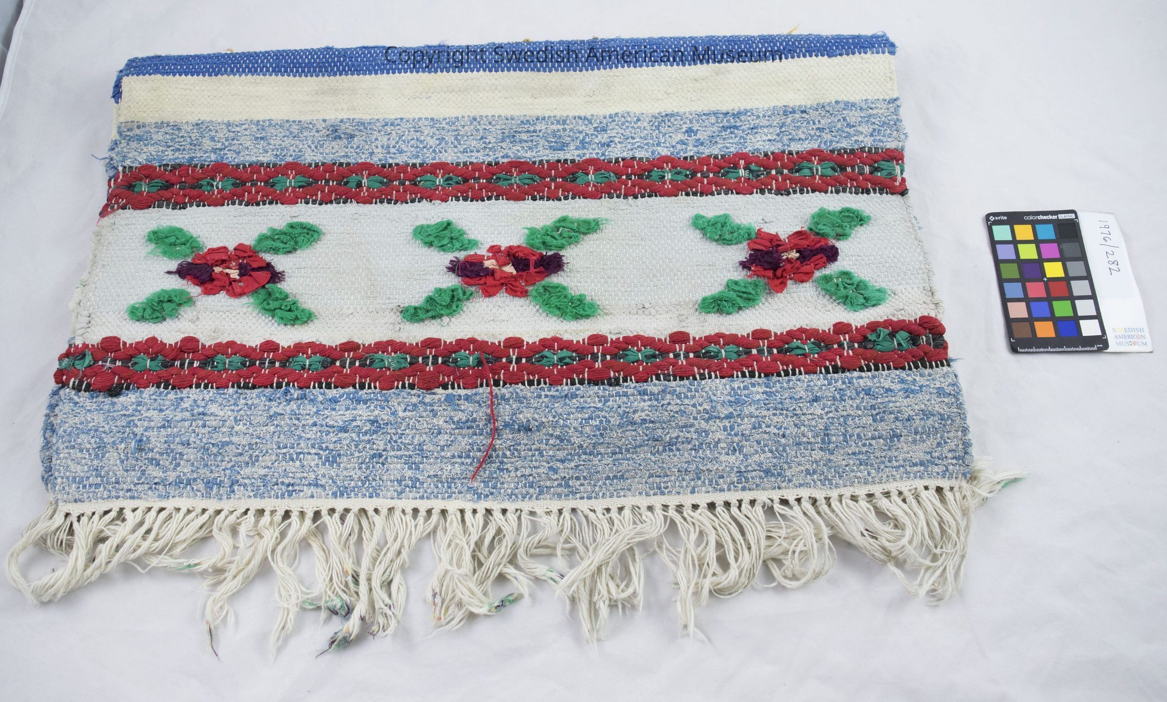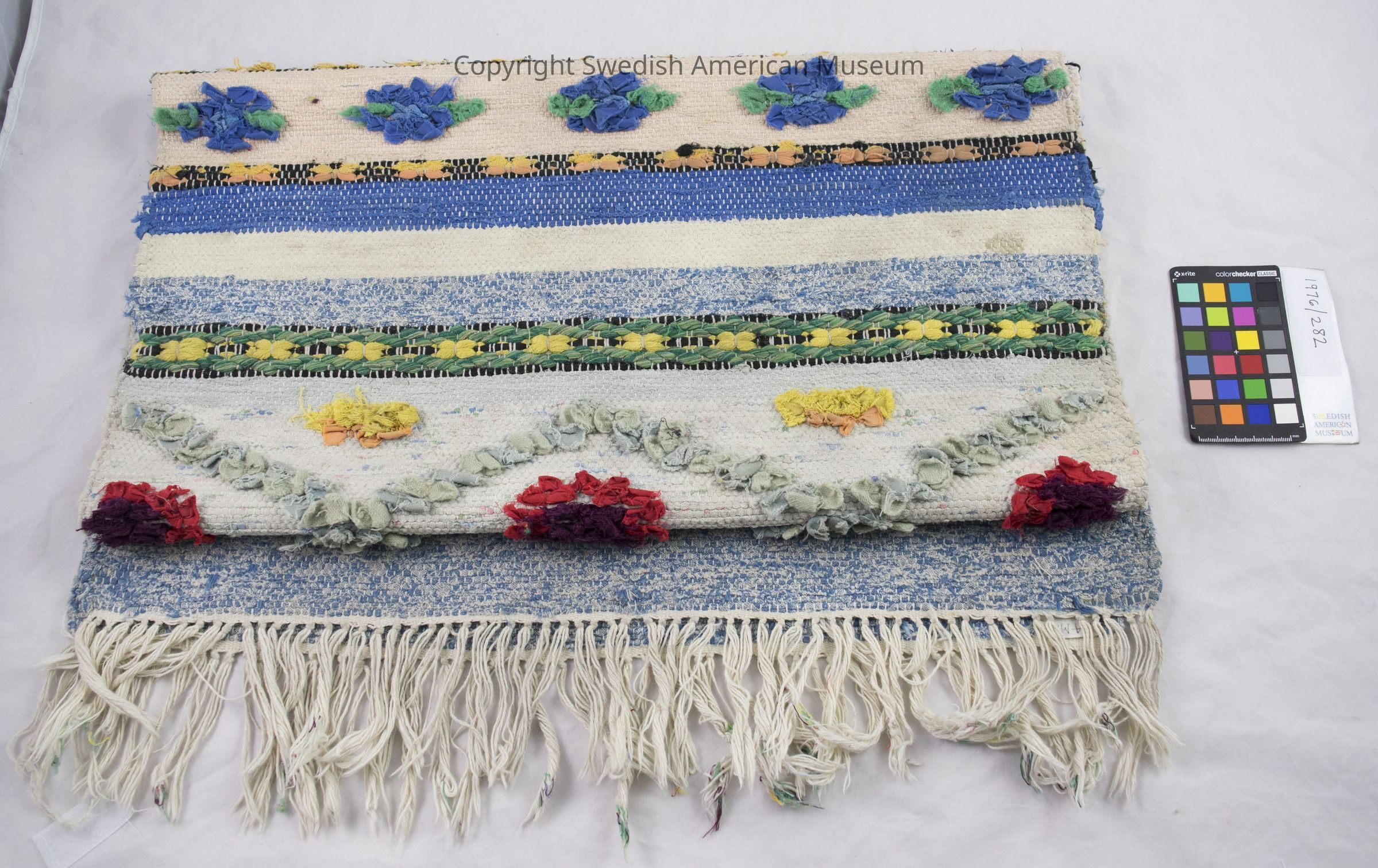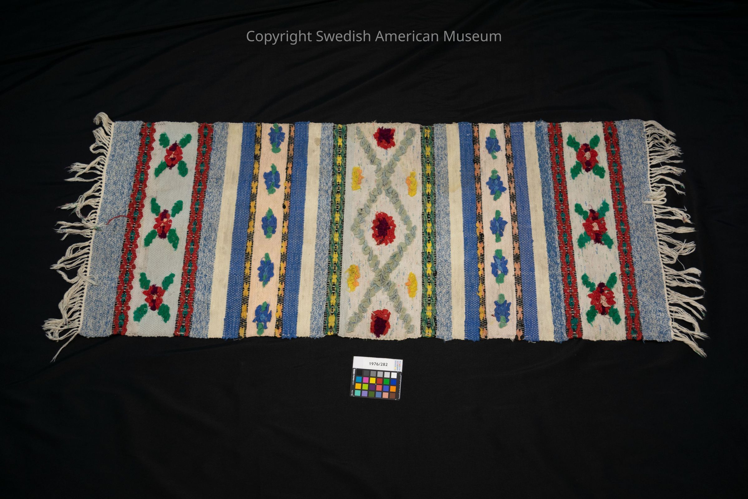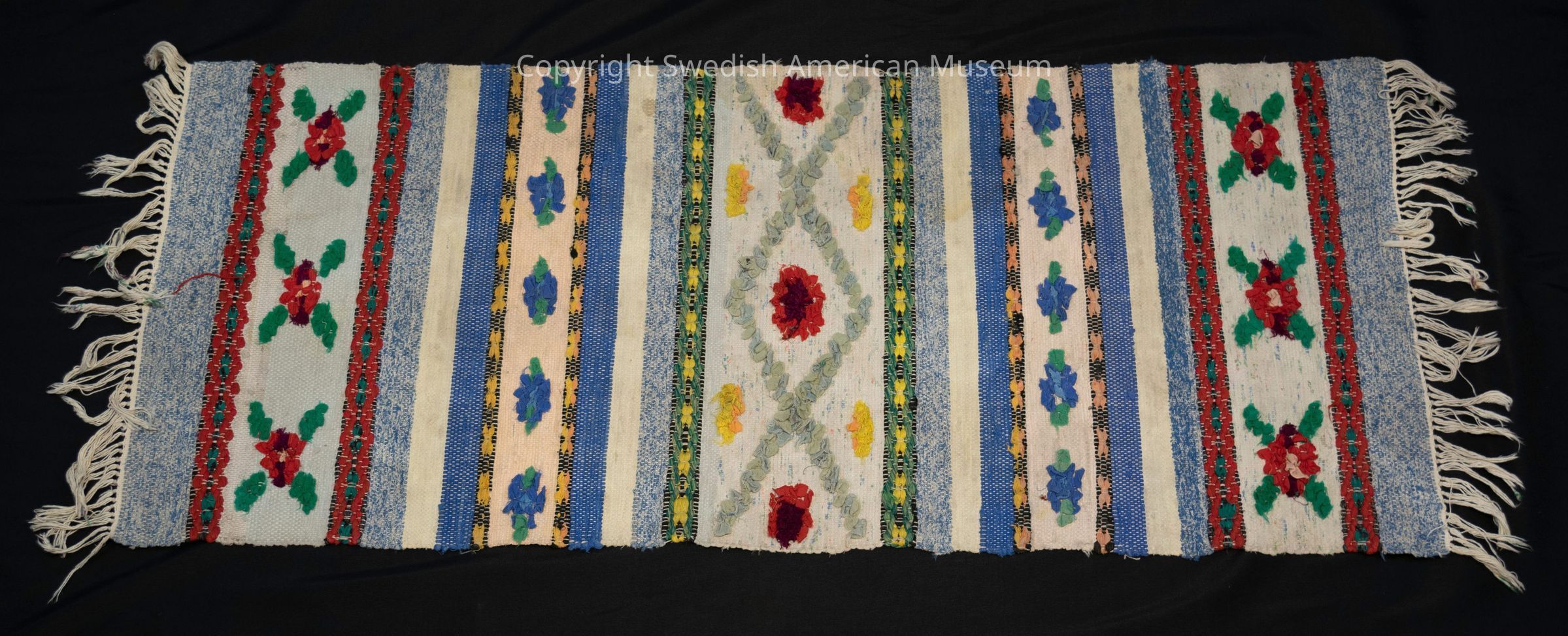 Handwoven rug. Burnt amber colored with stripes of star-shaped flowers, green, yellow dark brown on off white base with white fringe on the ends.Acquisition
