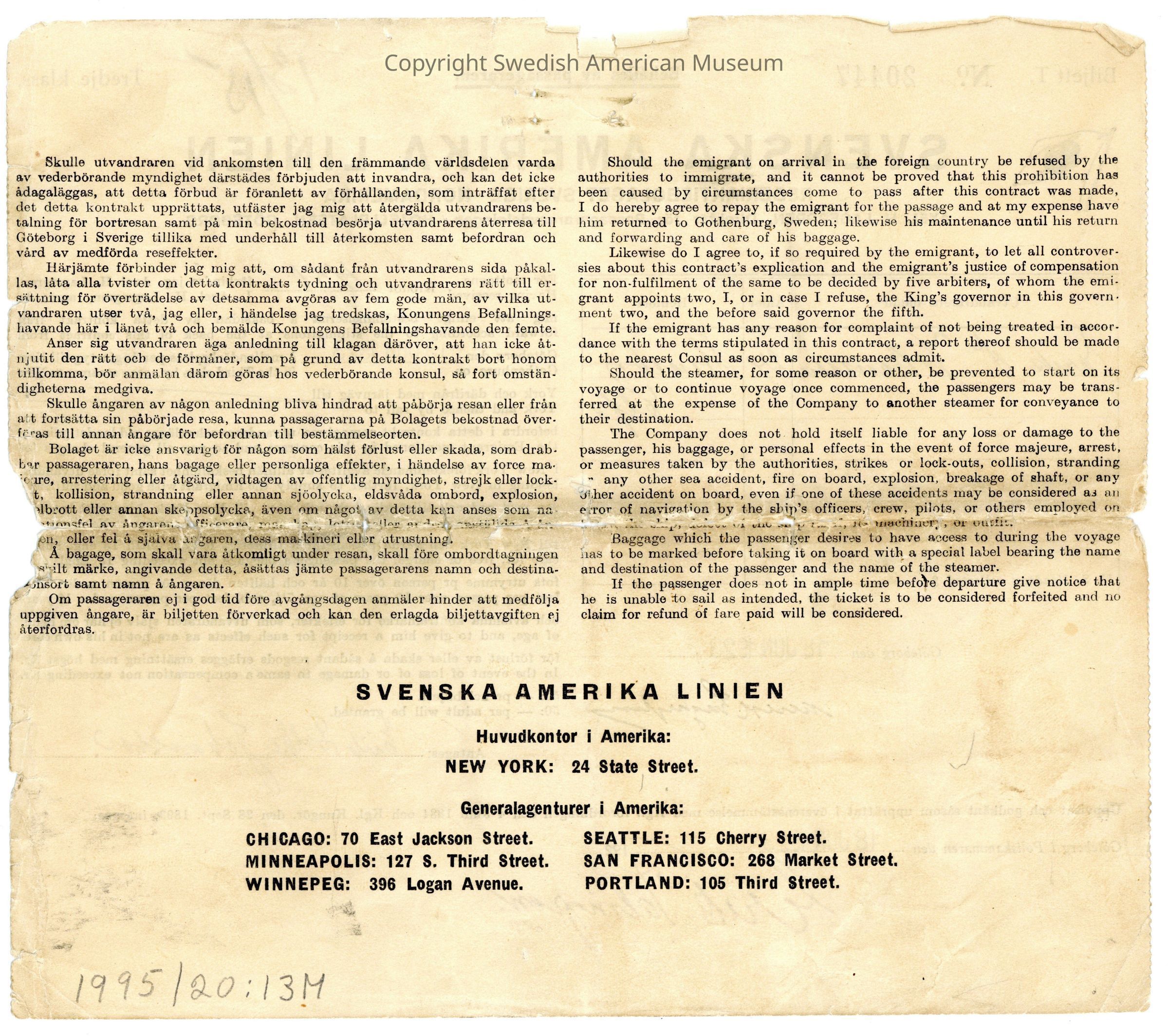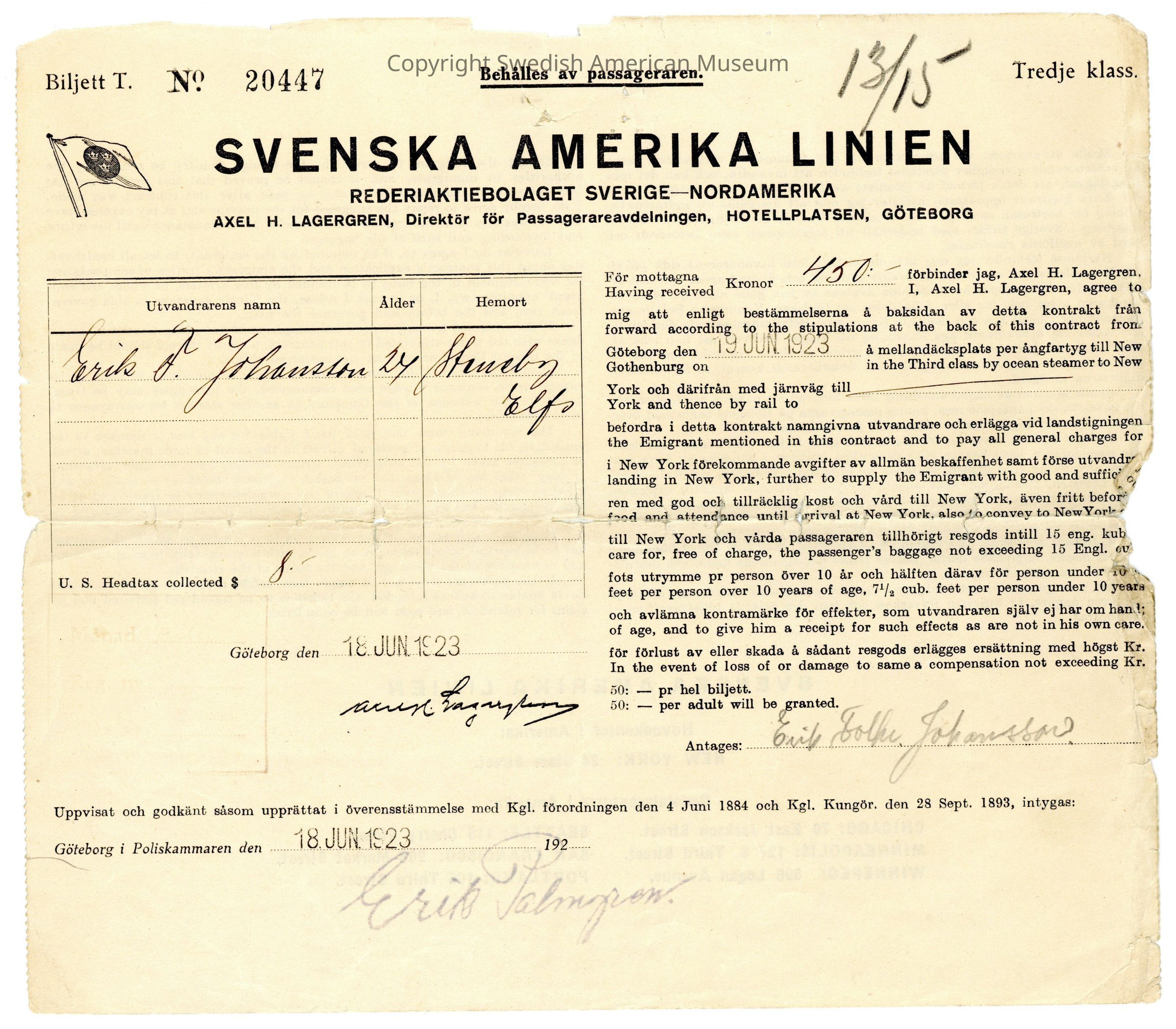 Swedish American Line third class ticket for 24 year old Erik Folke Johansson. The ticket cost was 450 SEK and the ship left Göteborg on June 19th, 1923.Context
