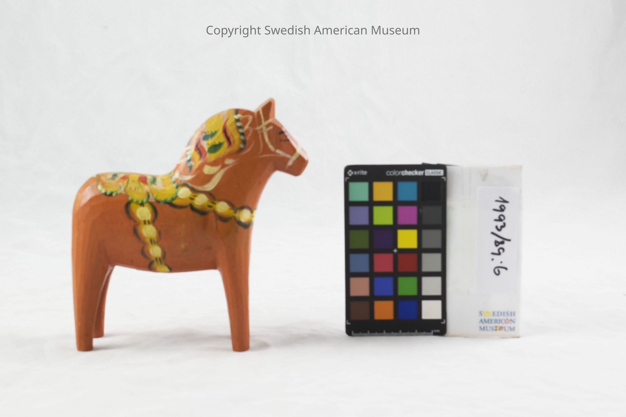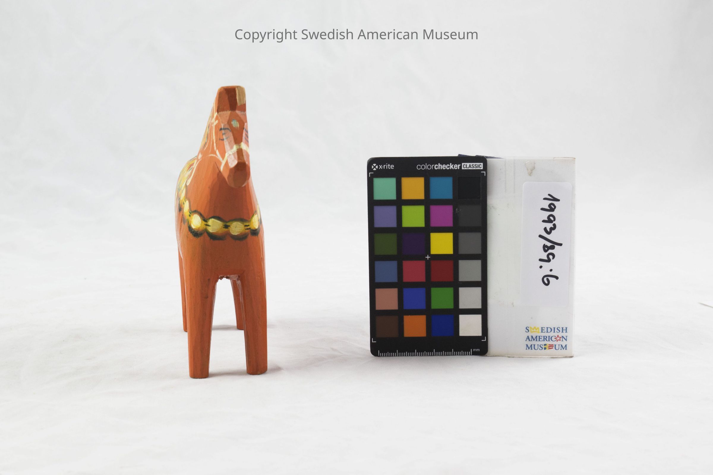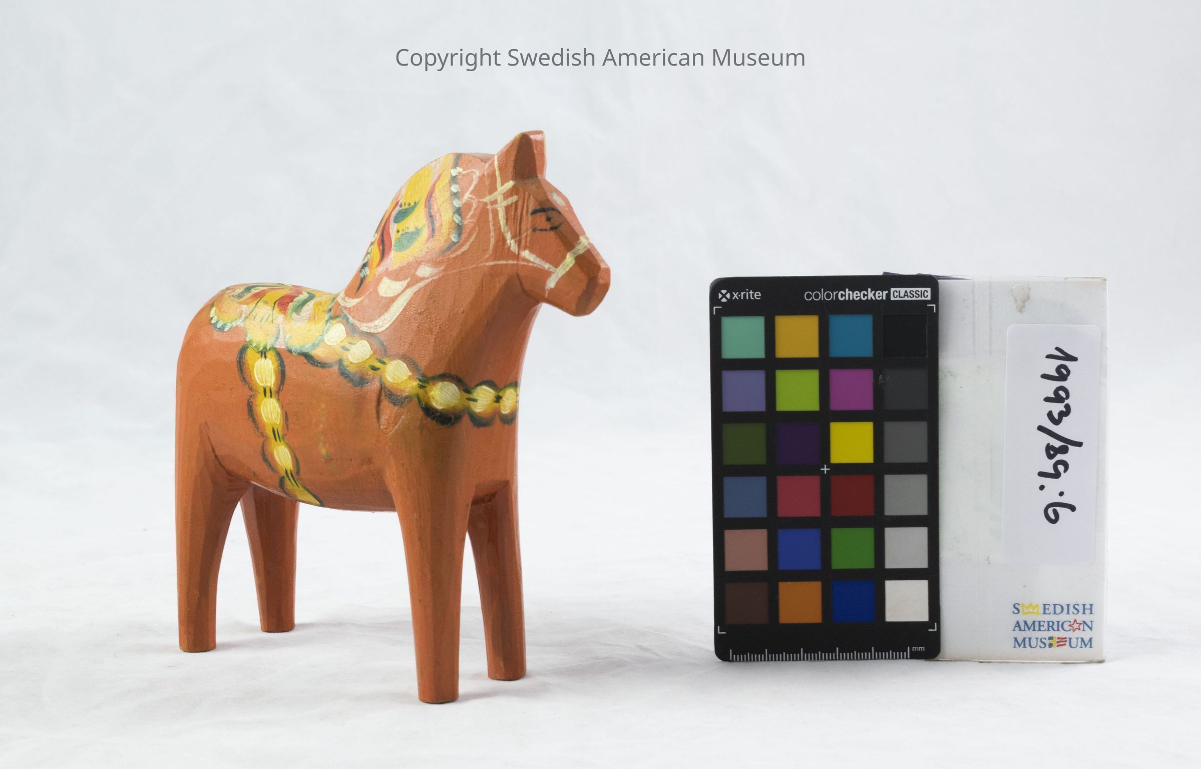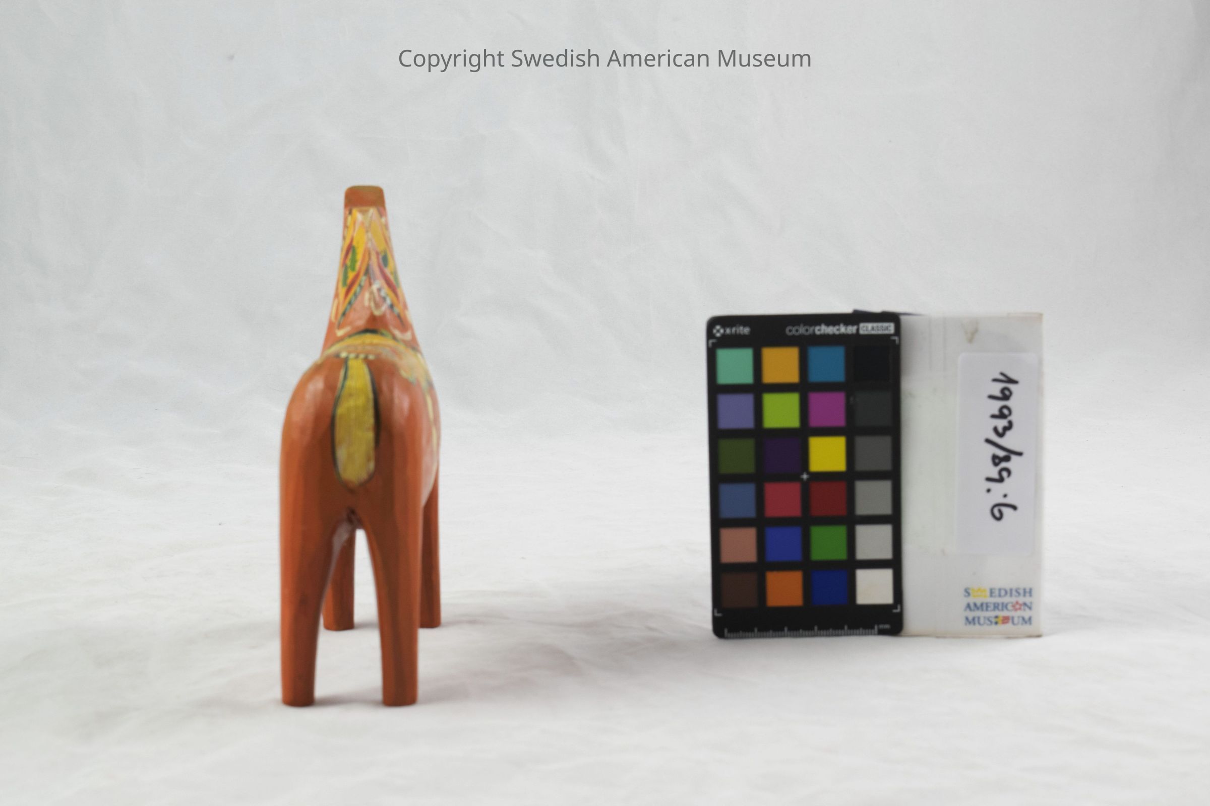 Dala Horse painted orange. It has Dalarna-style trim with a lot of flowers in red, green, and white. The tail is painted yellow.