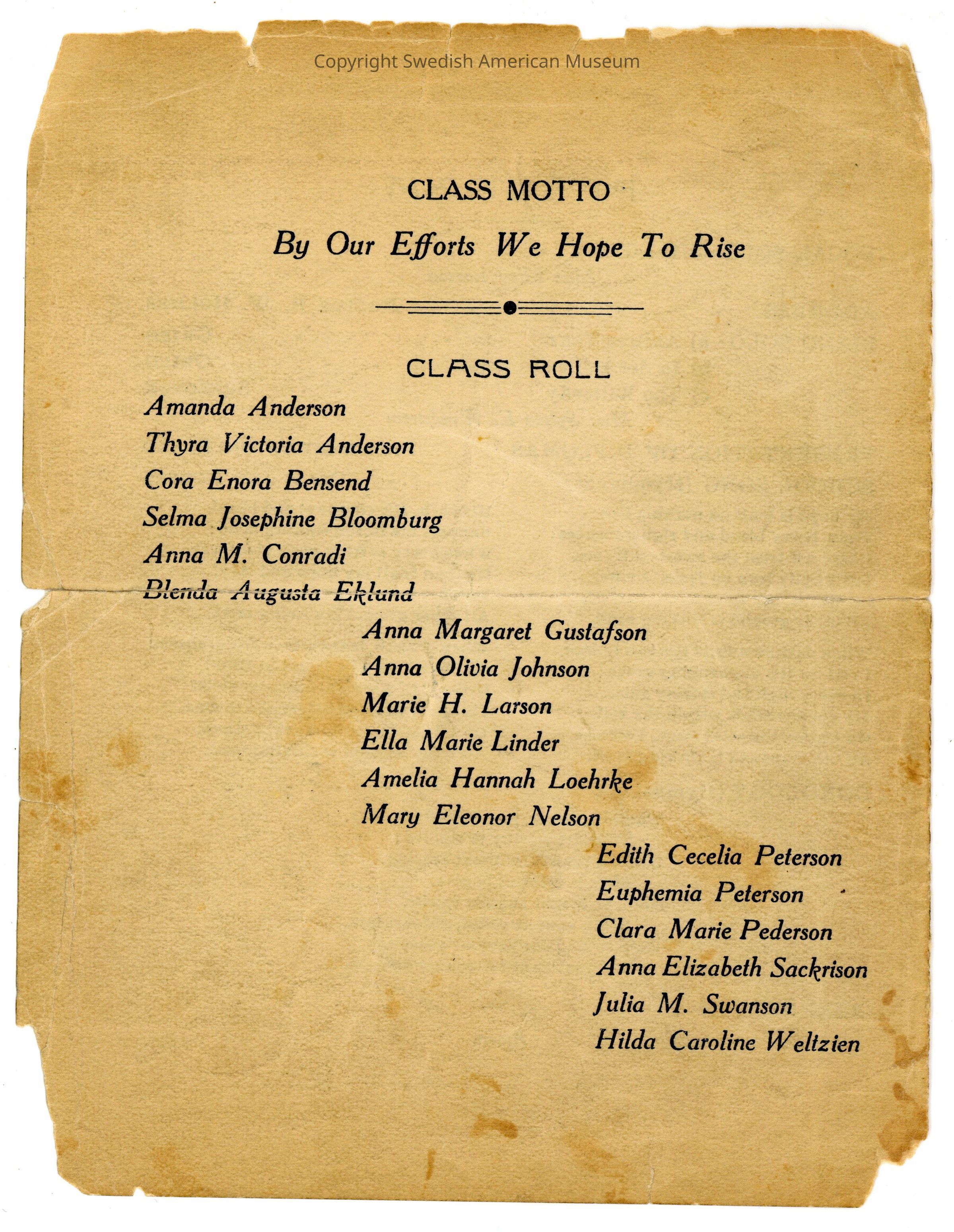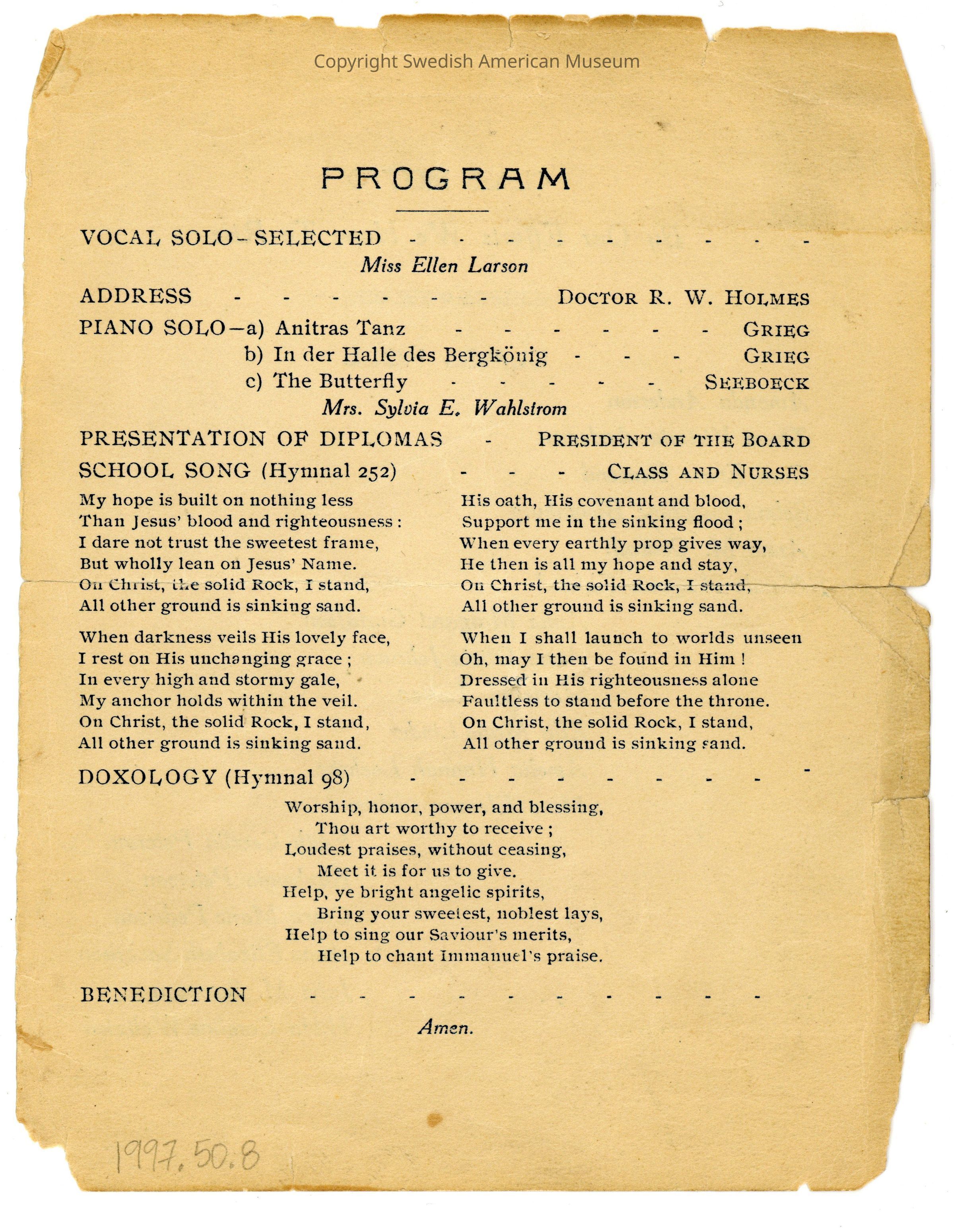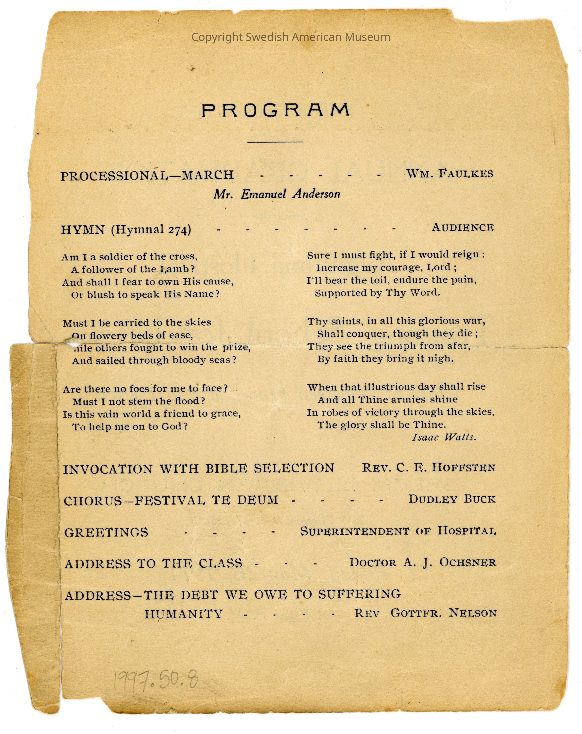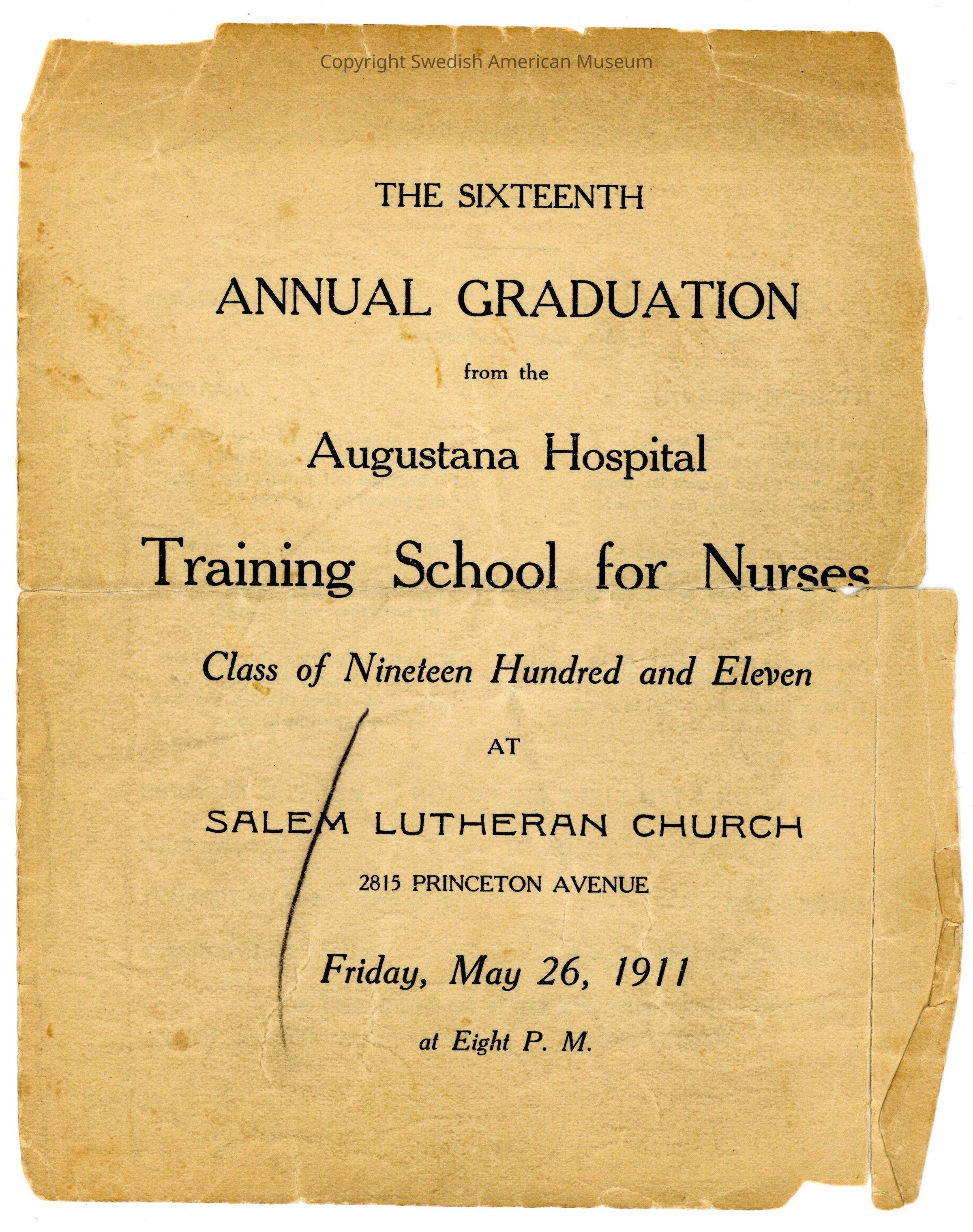 Graduation program from the Augustana Hospital Training School for Nurses held on May 26, 1911 at 8pm at Salem Lutheran Church. Includes program, class list and song.Context