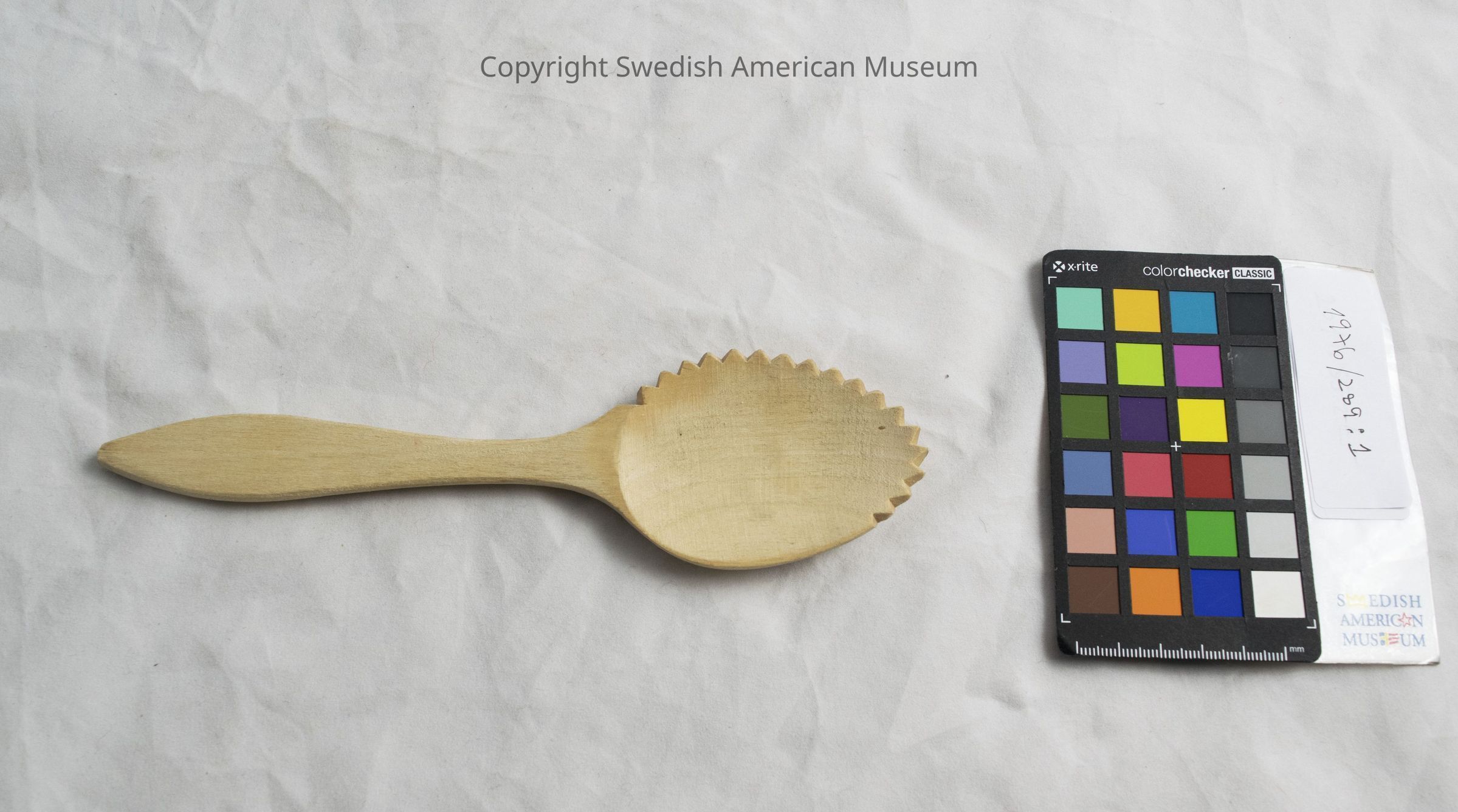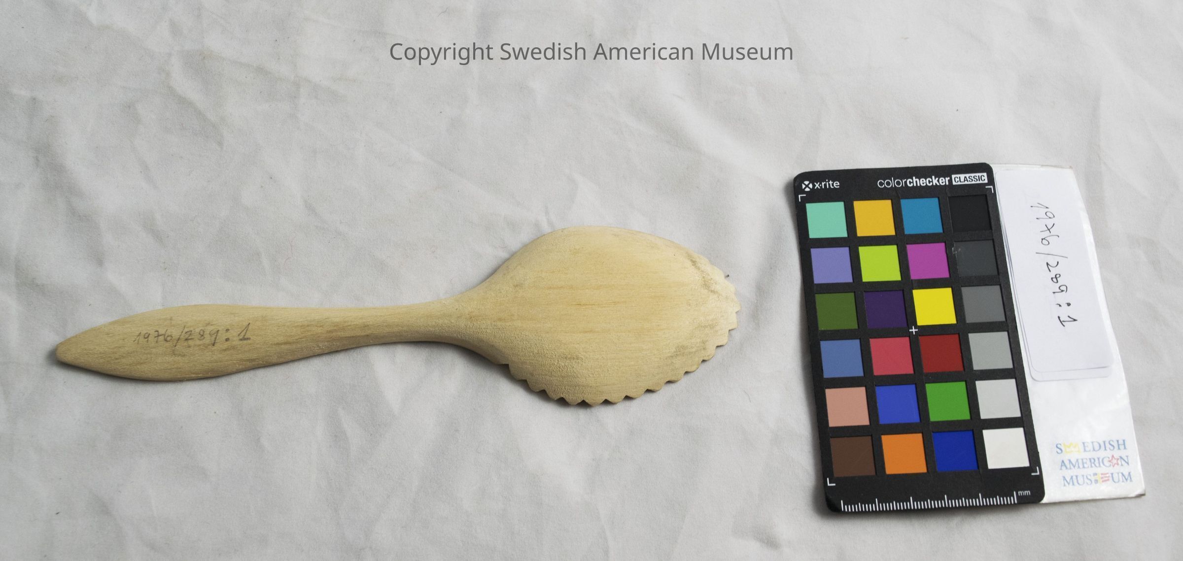 Hand carved wooden butter paddle with carved grooves for texturing butter. Nearly flat, rectangular with a rounded handle on one end. One side of paddle has ridges/fluting running parallel to the long side and the other side of the paddle has a beveled edge.Acquisition