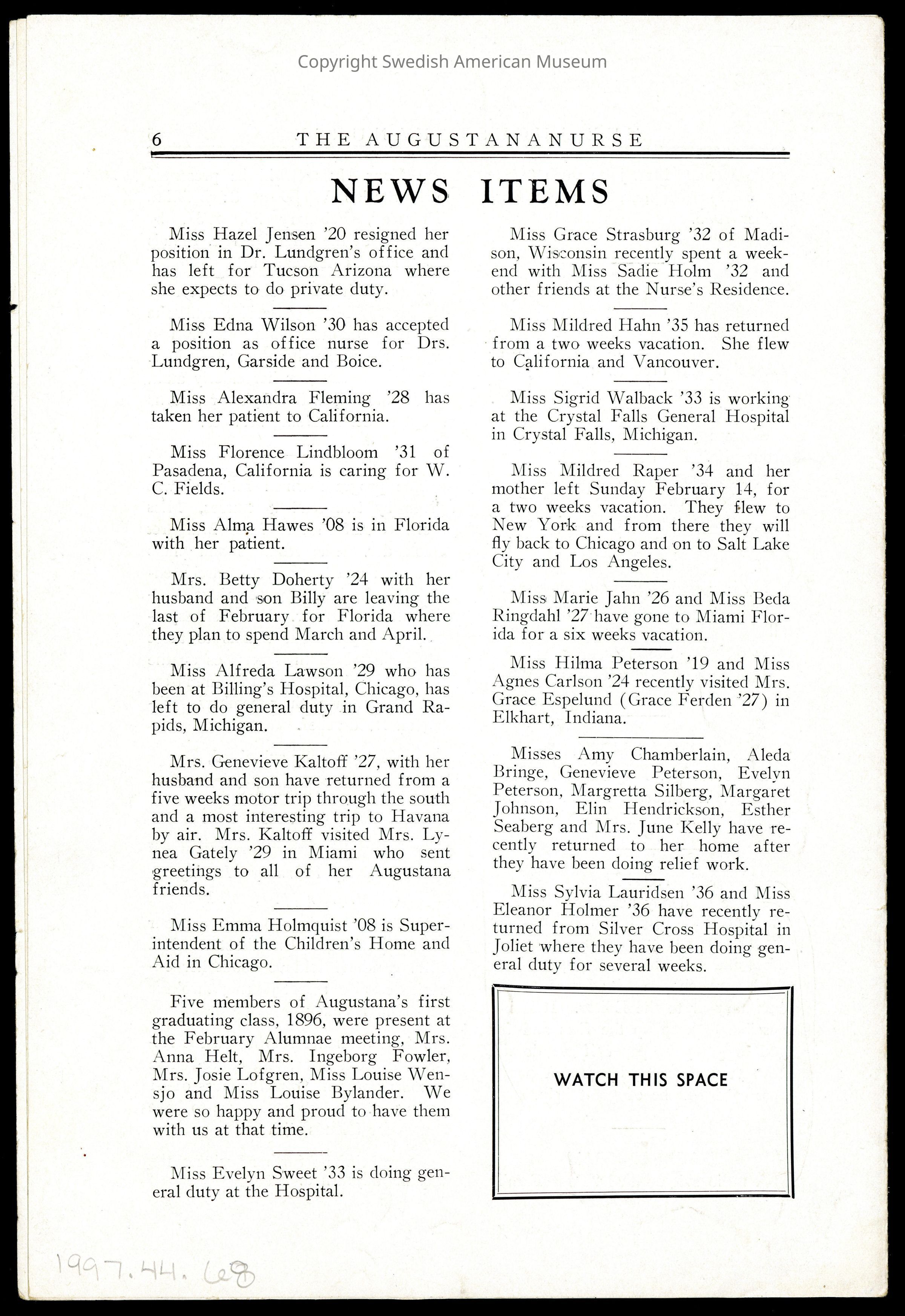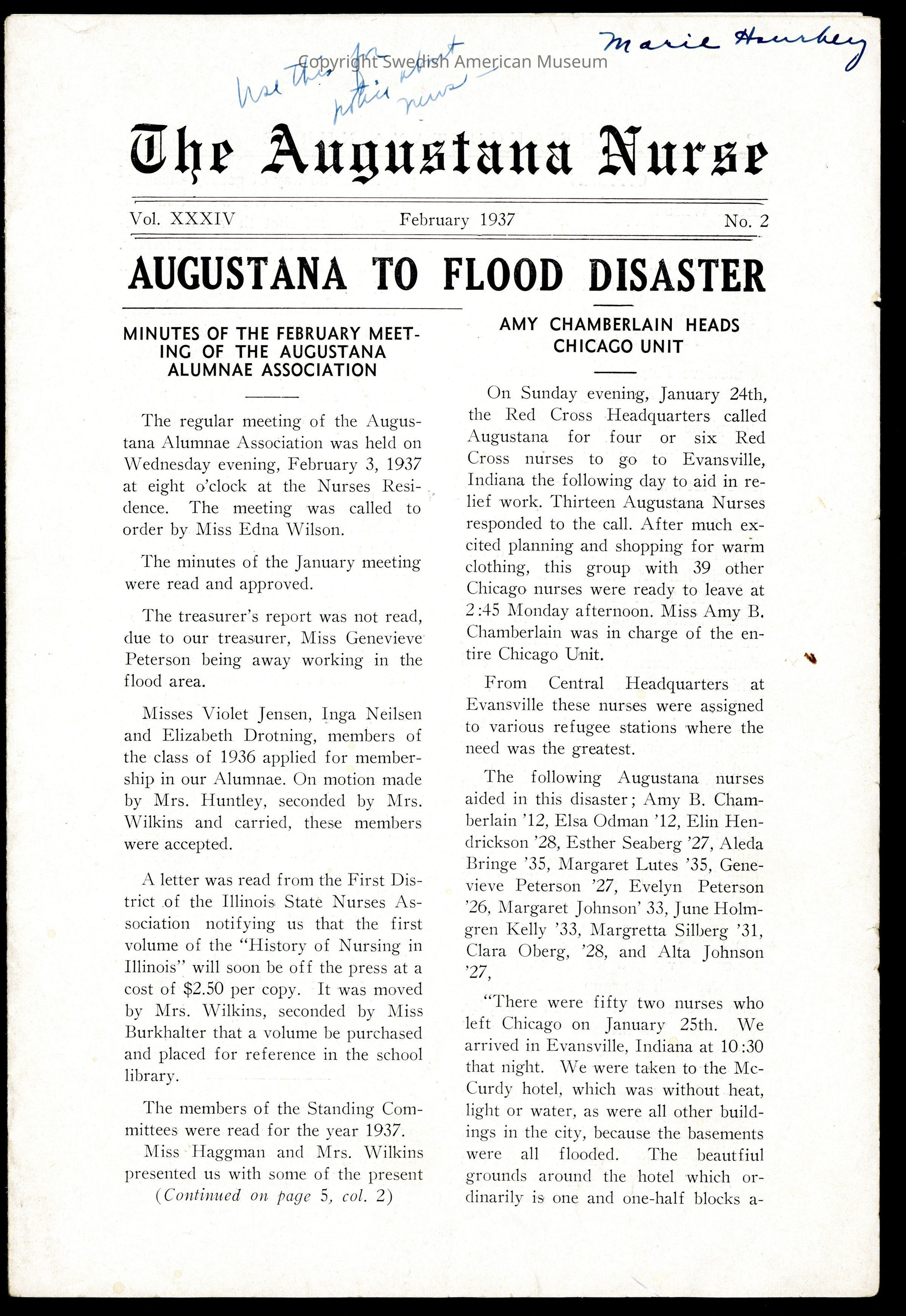 The Augustana Nurse Newsletter from Feb. 1937. Includes a headline titled "Augustana Flood Disaster."