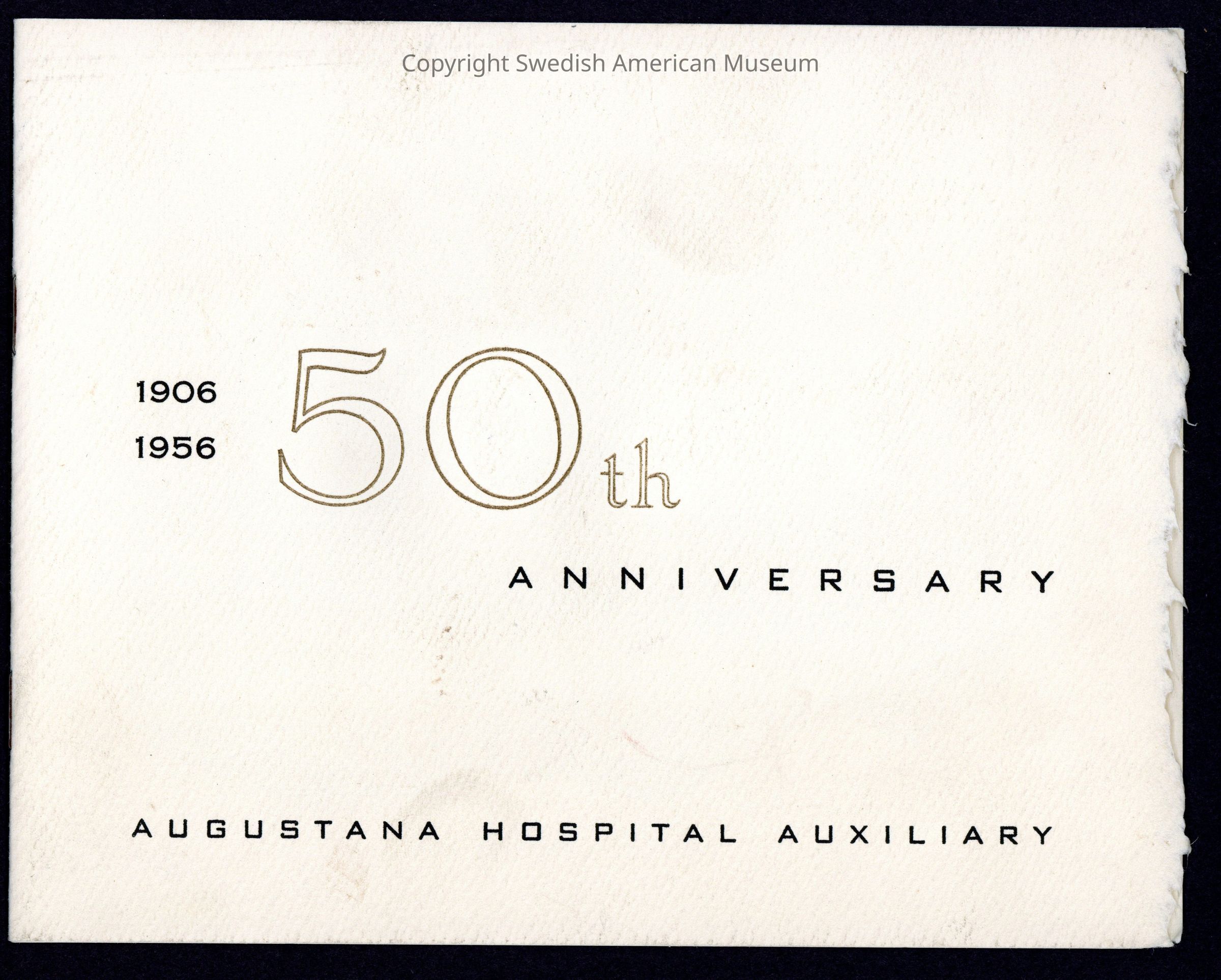 White paper invitation for the 50th anniversary of Augustana Hospital Auxiliary in Chicago, Illinois. The cover reads "1906-1956 50th Anniversary Augustana Hospital Auxiliary" in gold.