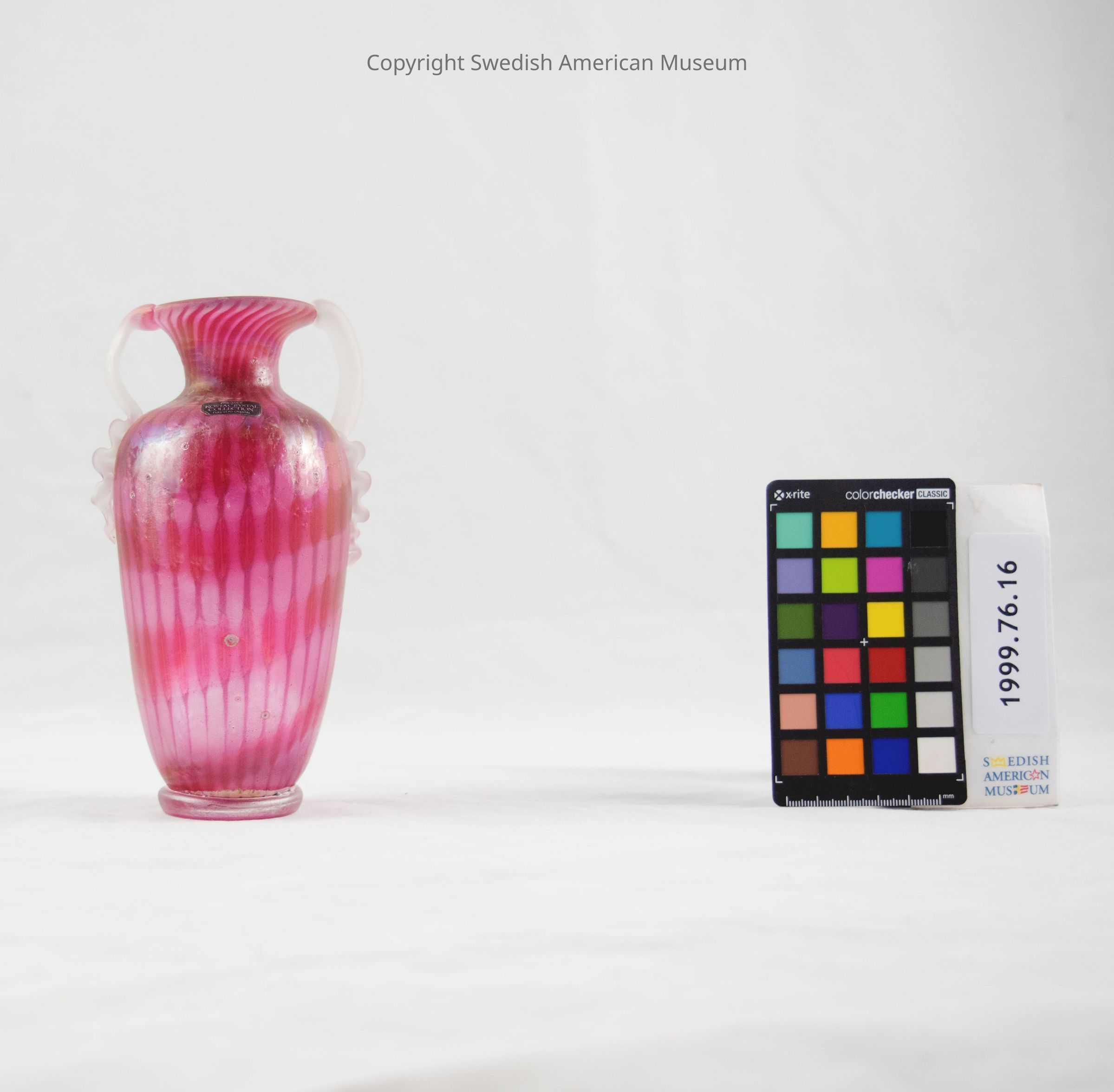 Kosta Boda small pink vase with variegated shades of pink by Bente Heintze. 'Variegated' means diversified by patches of different colors. Oblong body with two decorative handles, one on each side. The body of the vase tapers into a thin neck which then flares out at the mouth of the vase. Manufactured by Kosta Boda in Sweden. Engraving on the bottom reads "B. Heintze Kosta 81". Manufacturer's label reads "Handmade Kosta crystal collection. Full lead crystal".Acquisition