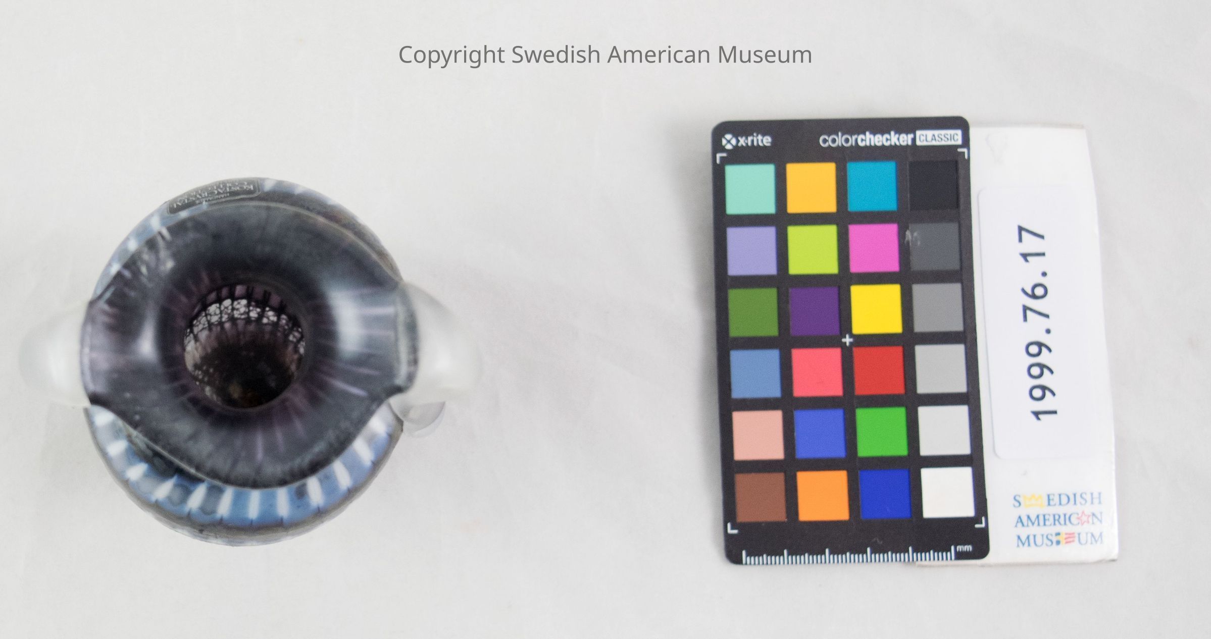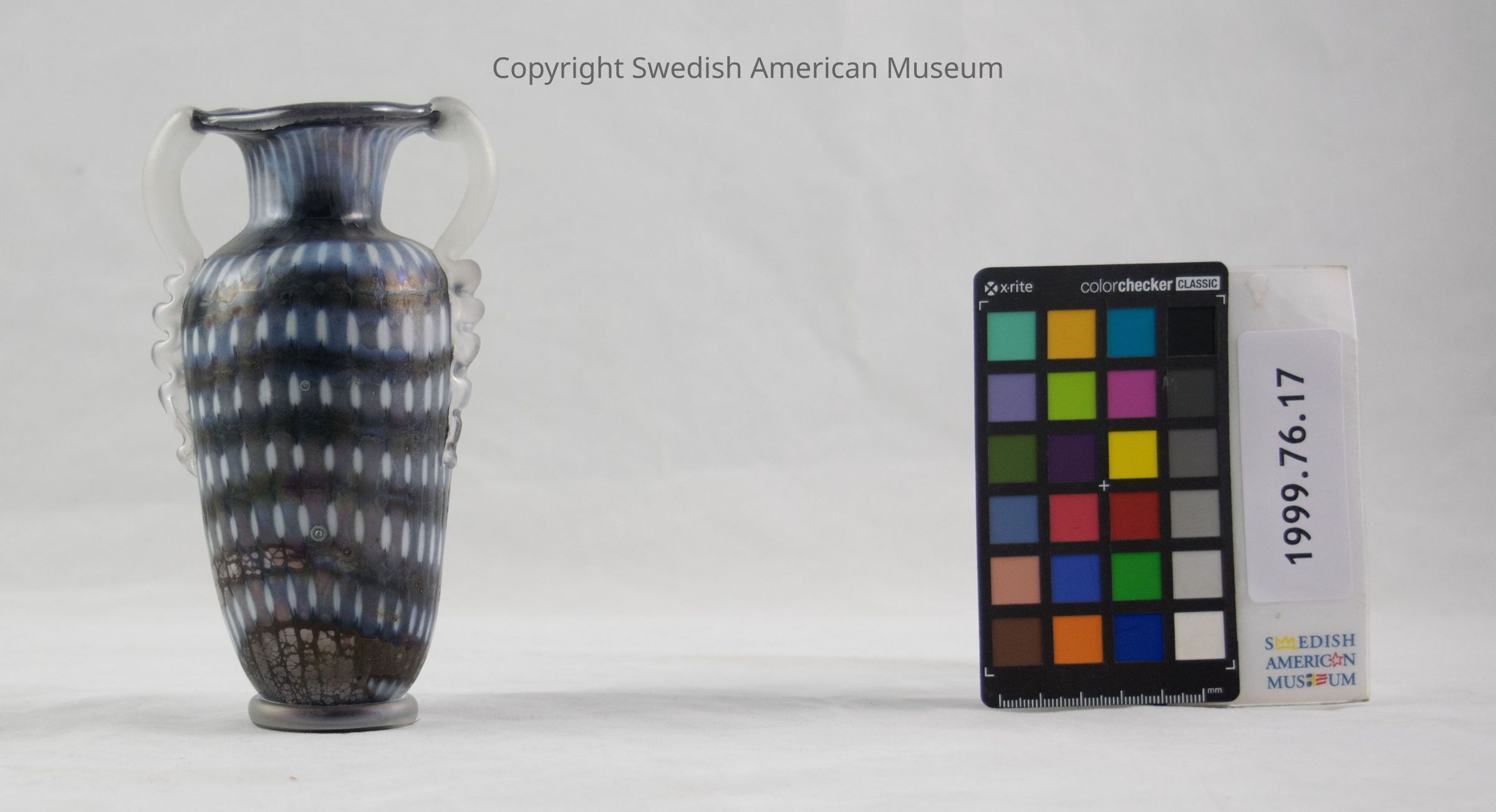 Kosta Boda black, gray, white and blue vase. Oblong body with two decorative handles, one on each side. The body of the vase tapers into a thin neck which then flares out at the mouth of the vase. Manufactured by Kosta Boda in Sweden. Engraving on the bottom reads "B. Heintze Kosta 84". Appraisal sticker on bottom reads "700:-". Manufacturer's sticker reads 'Handmade Kosta crystal collection. Full lead crystal".Acquisition