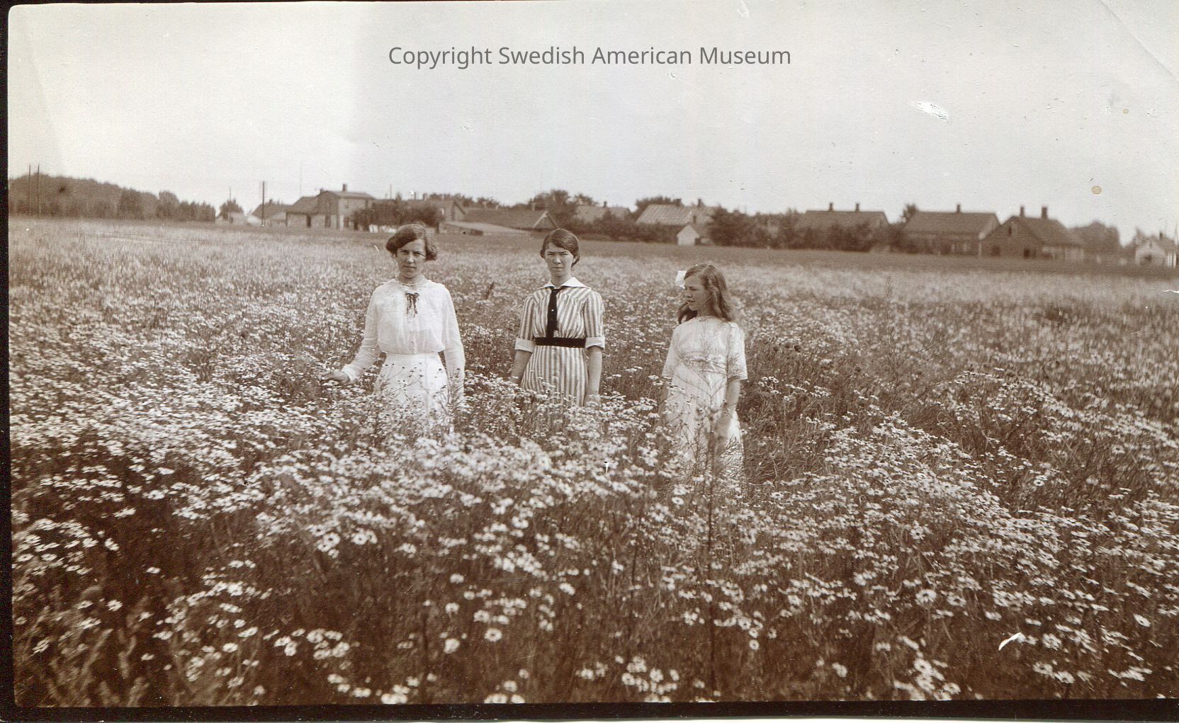 Photograph of three young women in light-colored dresses standing in a meadowlike area with daisy-like flowers.Title