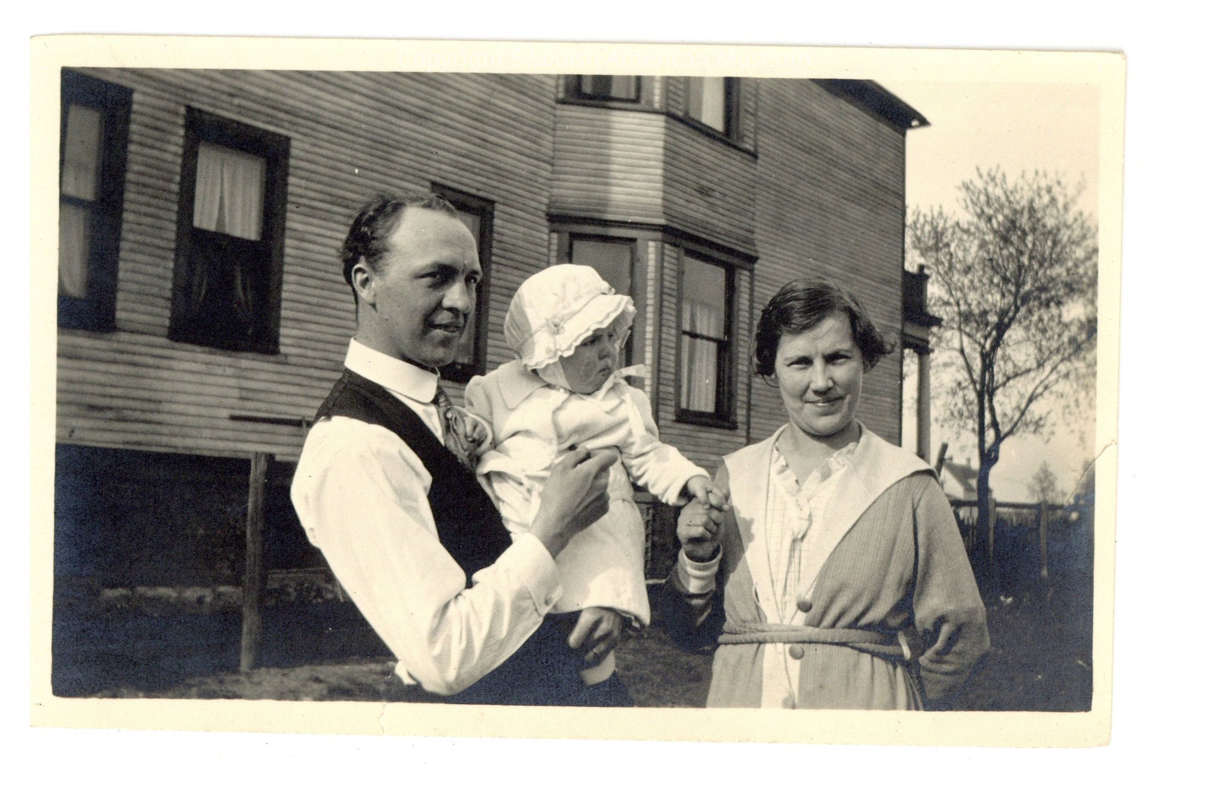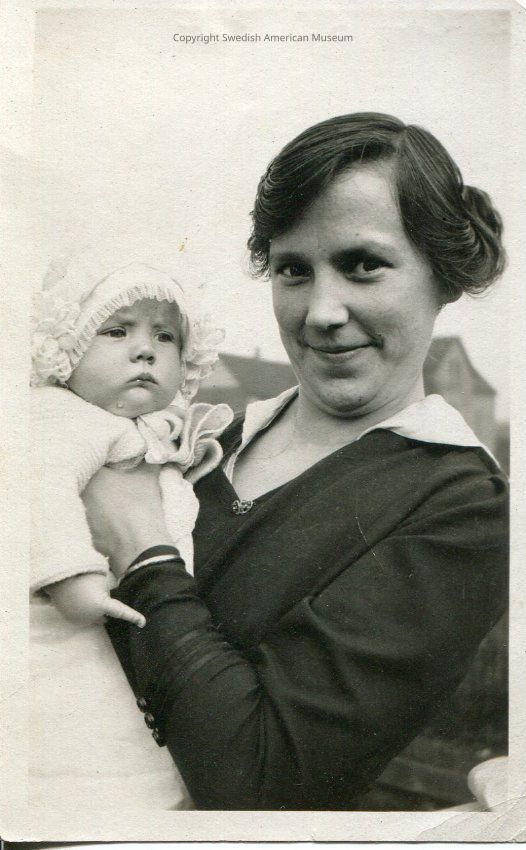 Photograph of a woman in a dark-colored dress holding a baby girl in a light-colored outfit.Title