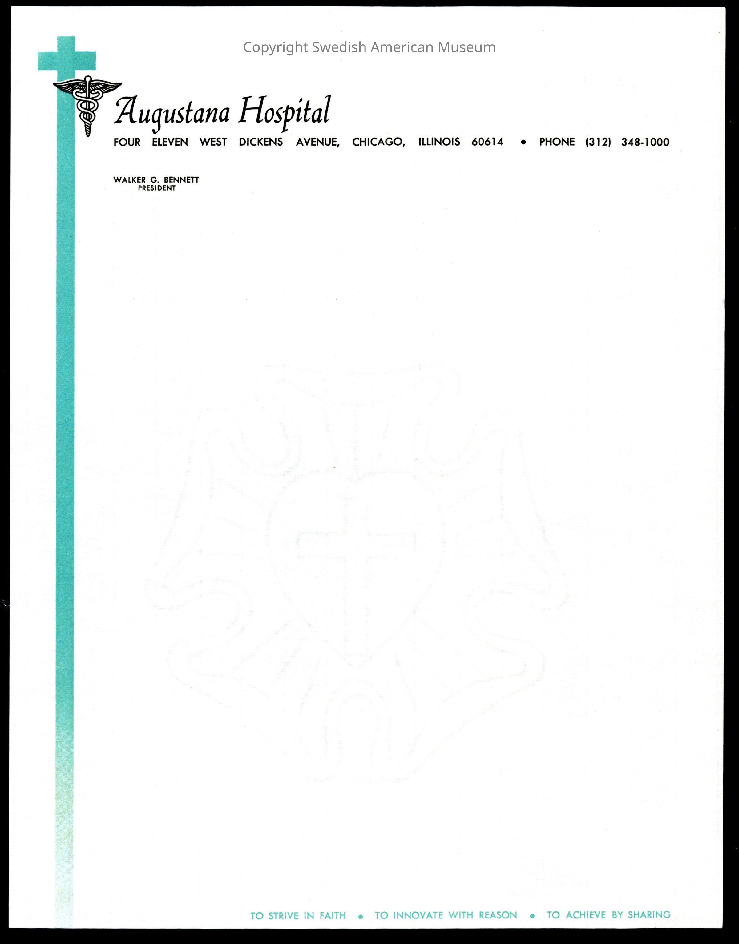 Stationery paper for Augustana Hospital, which features a teal cross that extends along the left side of the paper, and a caduceus or staff of Hermes symbol next to the hospital name. At the bottom, a motto reads, "to strive in faith, to innovate with reason, to achieve by sharing."Acquisition