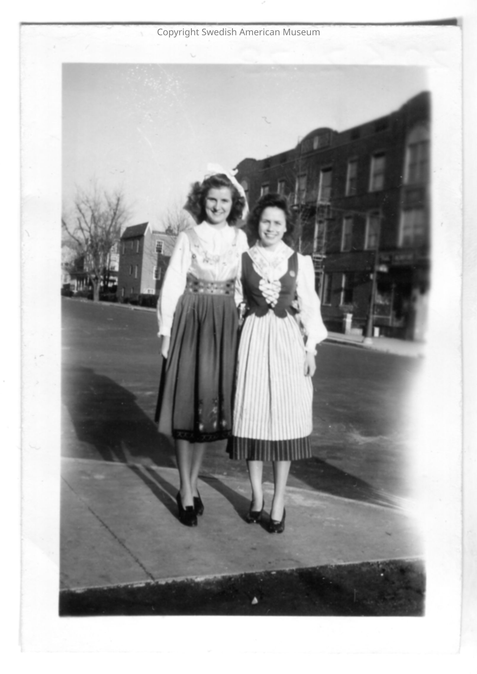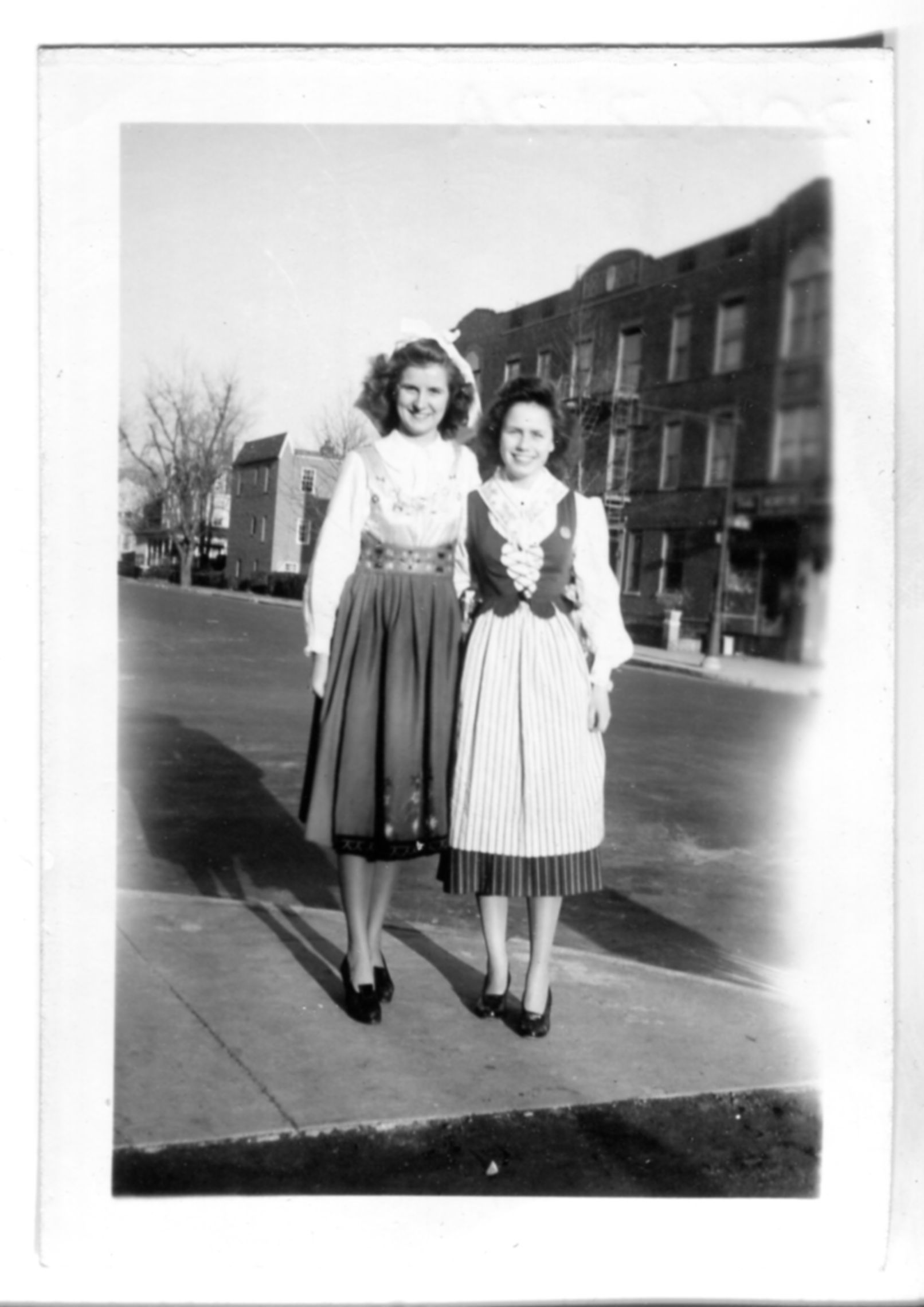 Identical to 2016.21.2A. Black-and-white photograph of Renee in a light-colored blouse and a dark-colored folk dress with a light-colored upper section and a dark-colored apron-like attachment and a young woman in a light-colored blouse and a dark-colored folk dress with a light-colored apron-like attachment. The measurements are 3.5 x 2.5 in.Title