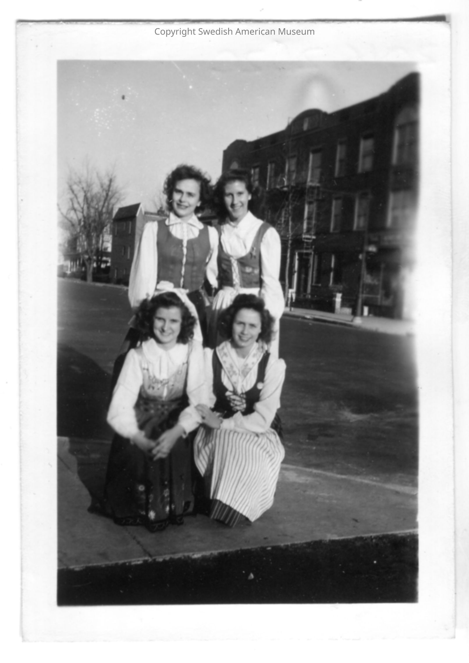 Black-and-white photograph of Renee in the same outfit that she is wearing in the previous photographs, as well as and three young women in light-colored blouses and dark-colored folk dresses with light-colored apron-like attachments. The measurements are 3.5 x 2.5 in.Title