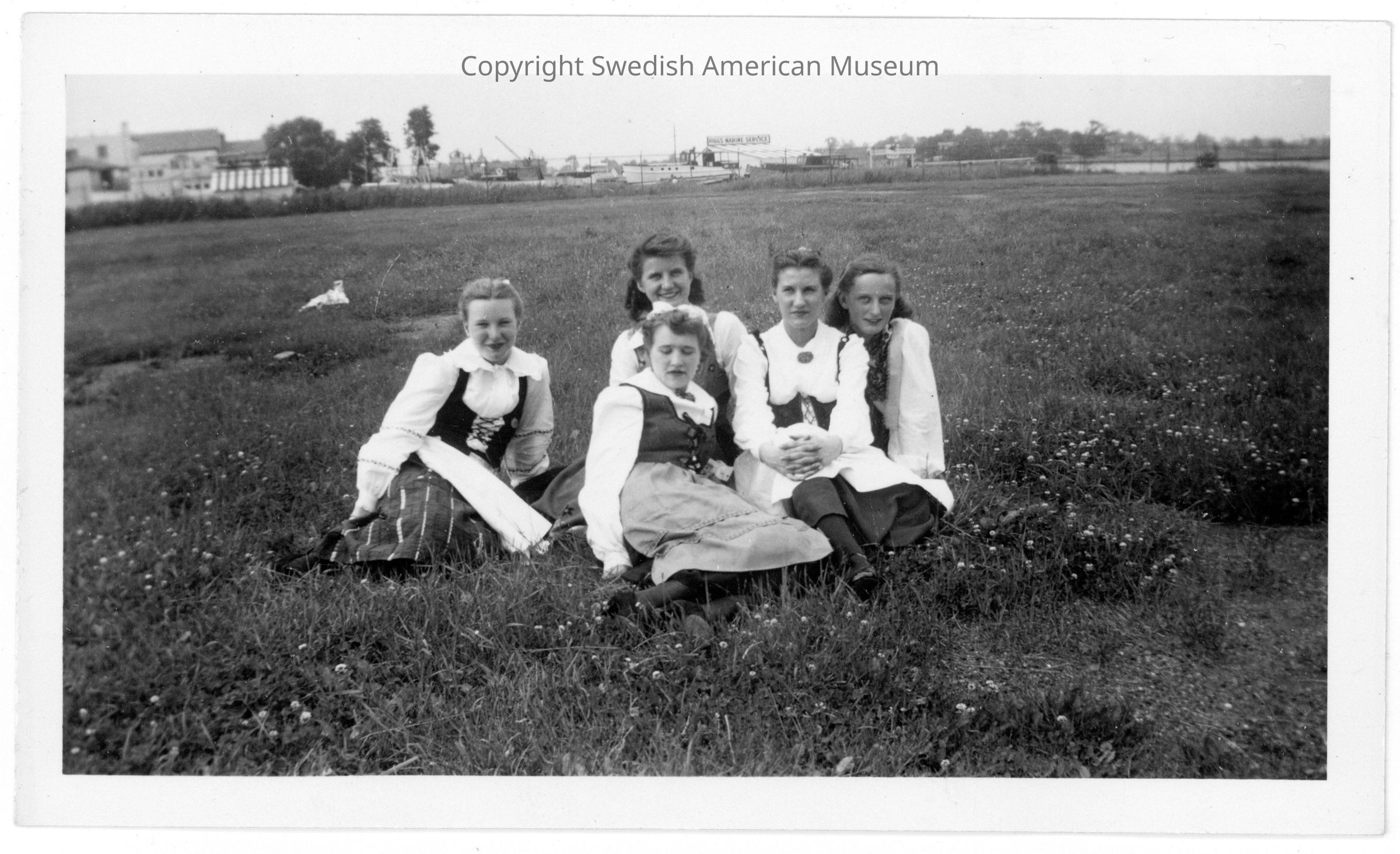 Black-and-white photograph of Renee in the same outfit that she is wearing in the previous photographs, as well as two young women in light-colored blouses and dark-colored folk dresses with light-colored apron-like attachments and two young women in light-colored blouses and dark-colored folk dresses with dark-colored folk dresses with dark-colored apron-like attachments. The measurements are 2.75 x 4.5 in.Title