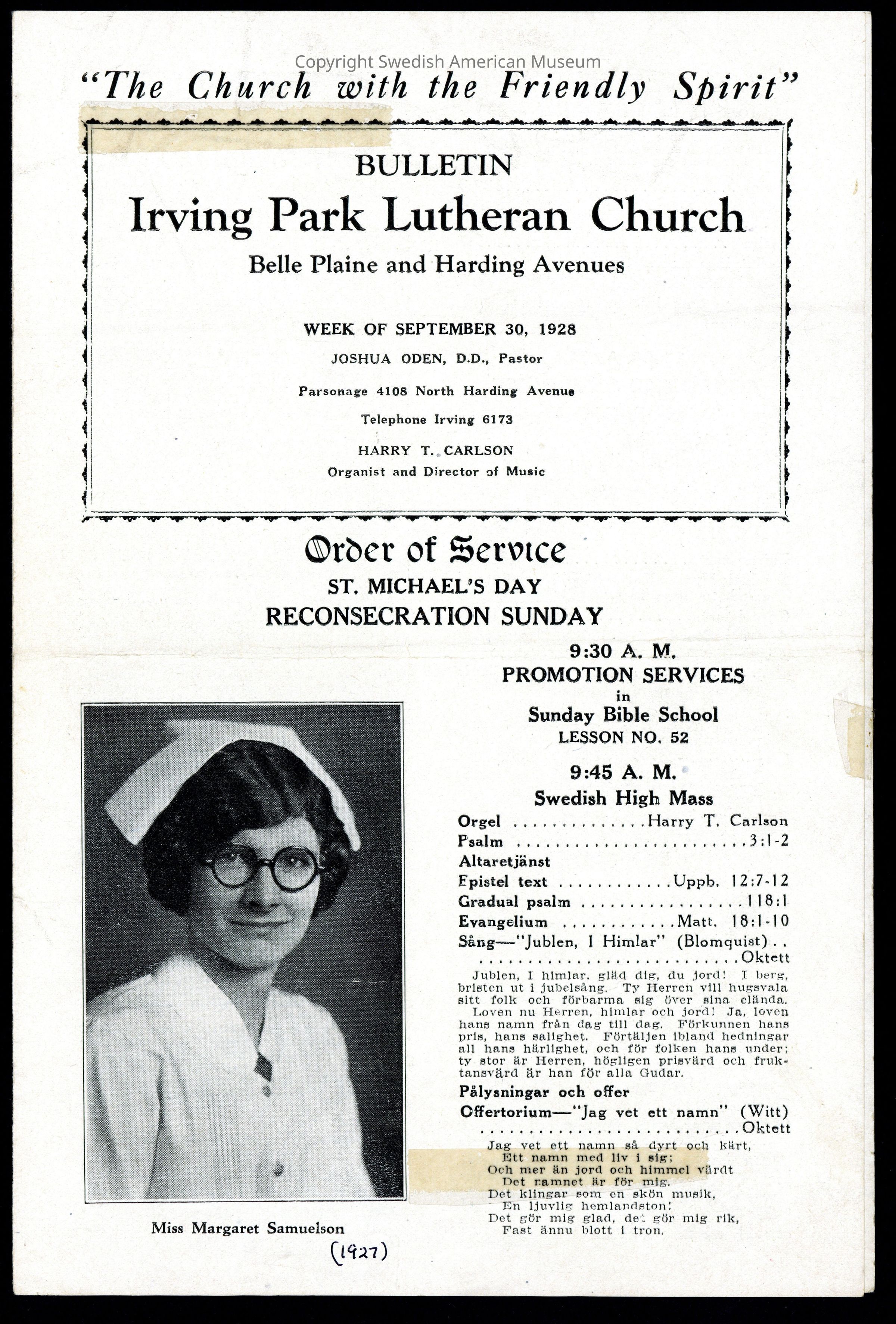 Bulletin for Irving Park Lutheran Church with the order of service. On the front is a picture of Miss Margaret Samuelson.