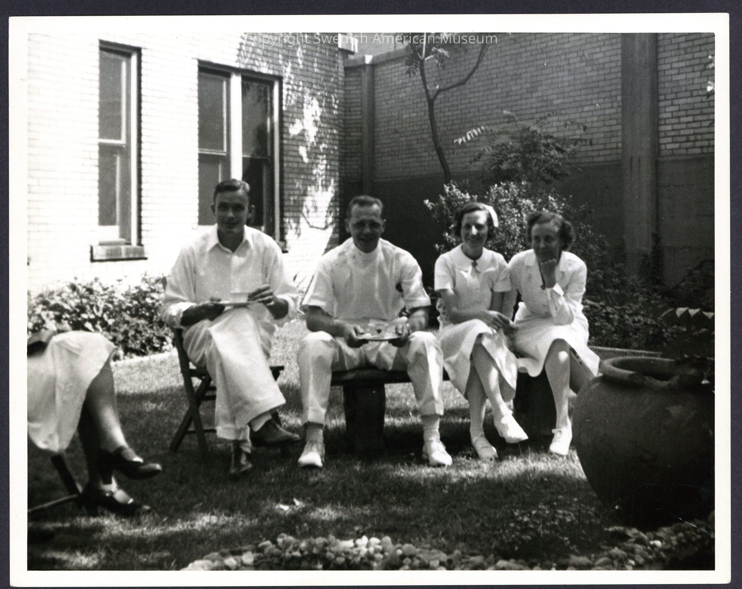 Black-and-white photograph of two interns and two nurses having tea in the garden at Augustana Hospital, Chucago, Illinois.