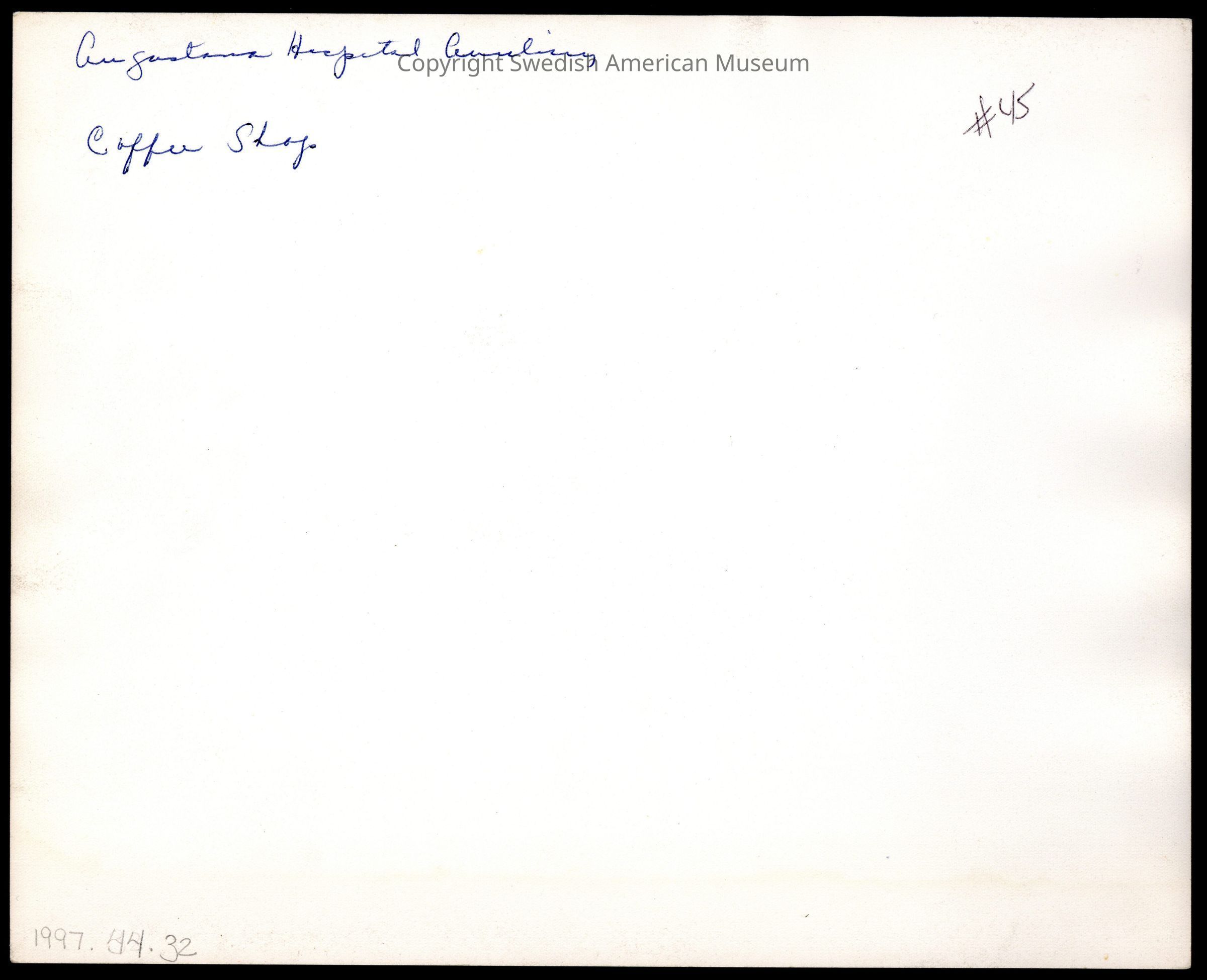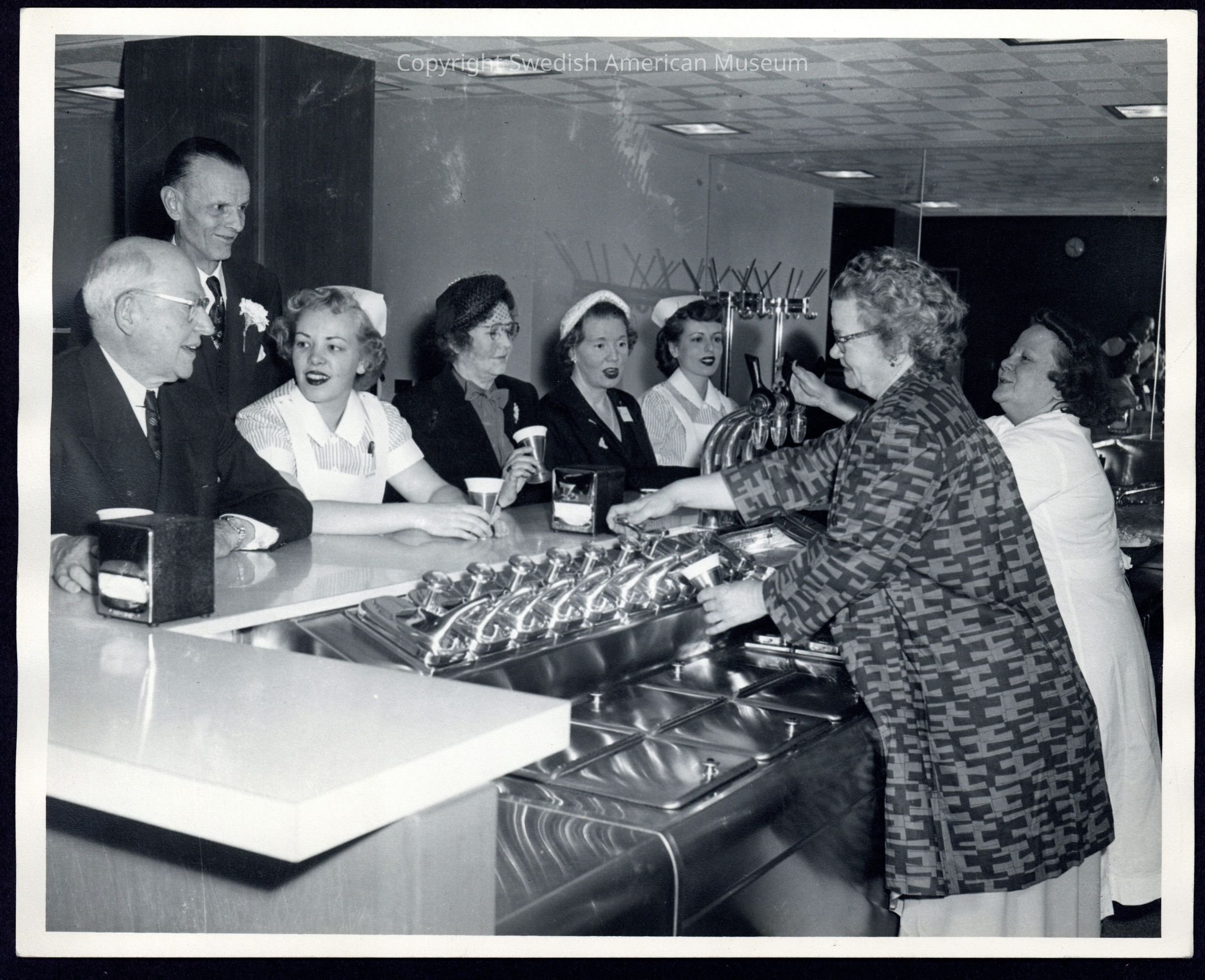 Black-and-white photograph of five people sitting at the counter in the coffee shop at the Augustana Hospital. One man, and four women. Another man stands behind them as two women behind the counter serve the group.