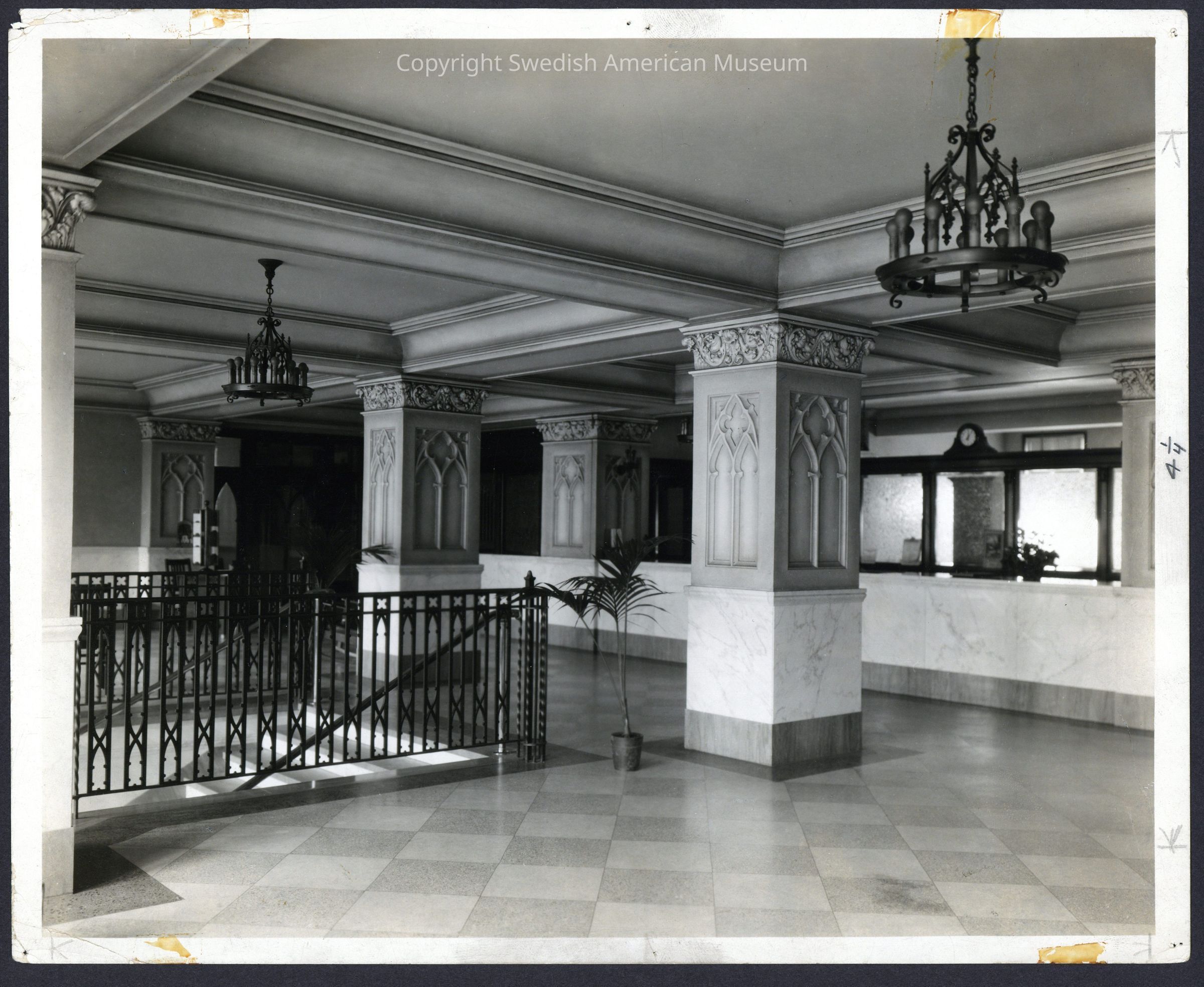 Black-and-white photograph of the lobby area in the administration building at the Augustana Hospital, with two large chandeliers hanging from the ceiling. The lobby also features decorative pillars, a simple railing for the staircase, and a small, potted tree.
