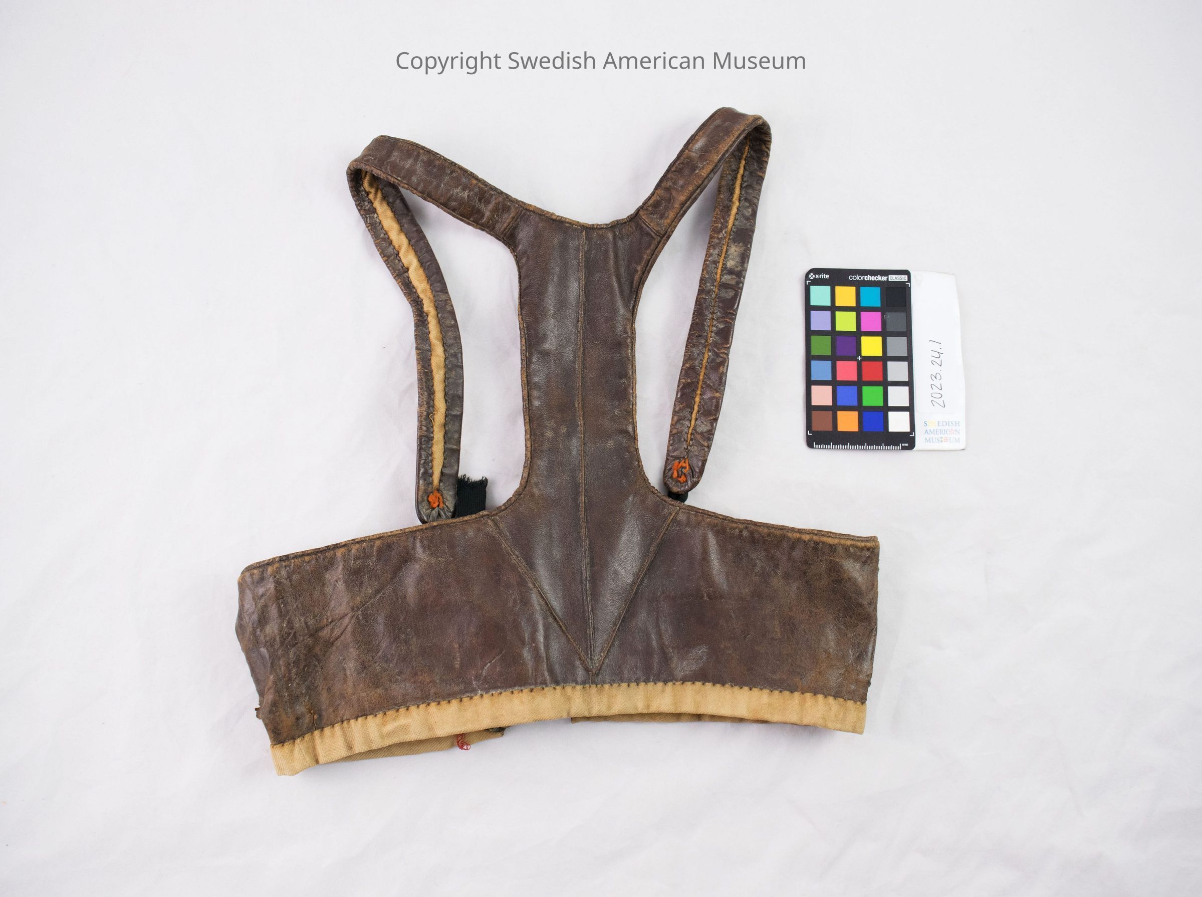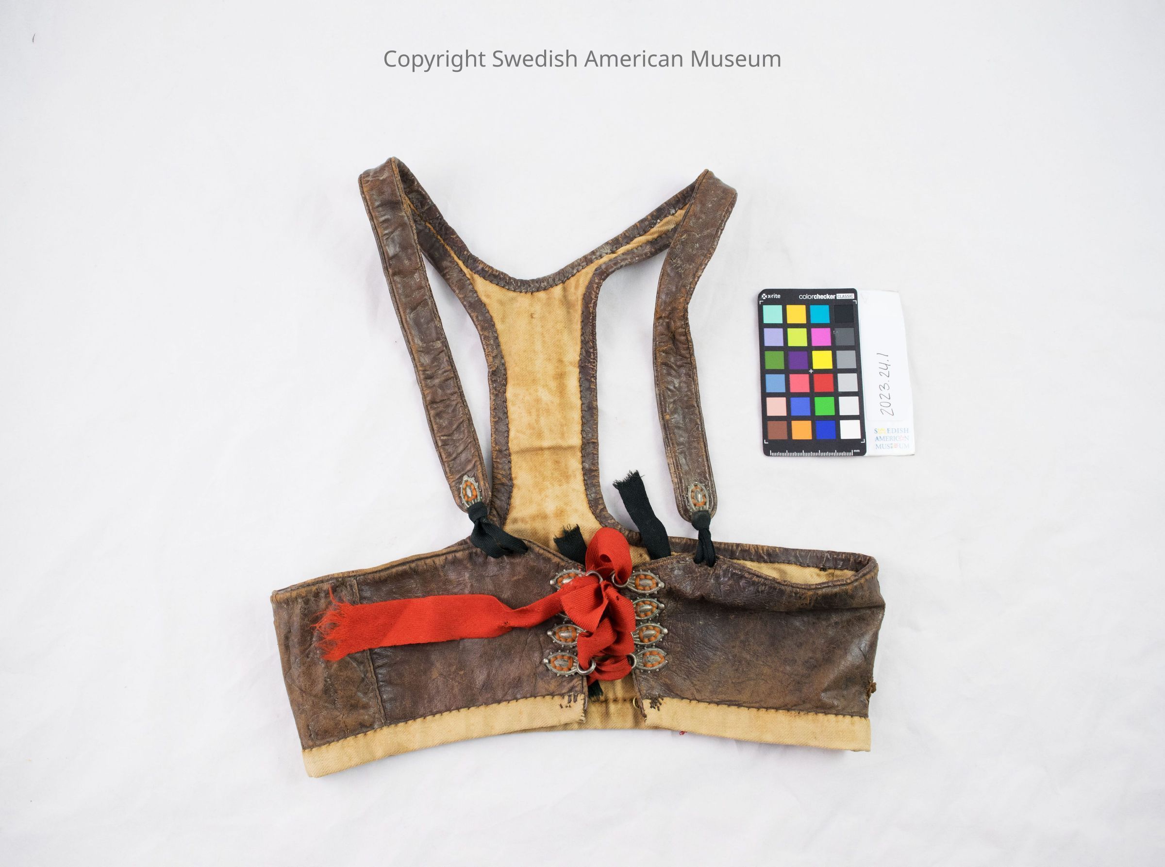 Woman's leather folk dress vest. Brown leather with an adjustable red ribbon tied in the front. Two front pieces with shoulder straps attached with black fabric and silver colored metal grommets attached with orange embroidery. Cotton twill lining. Four pairs of silver colored metal grommets to loop the ribbon through, decorated and attached with orange embroidery.Context