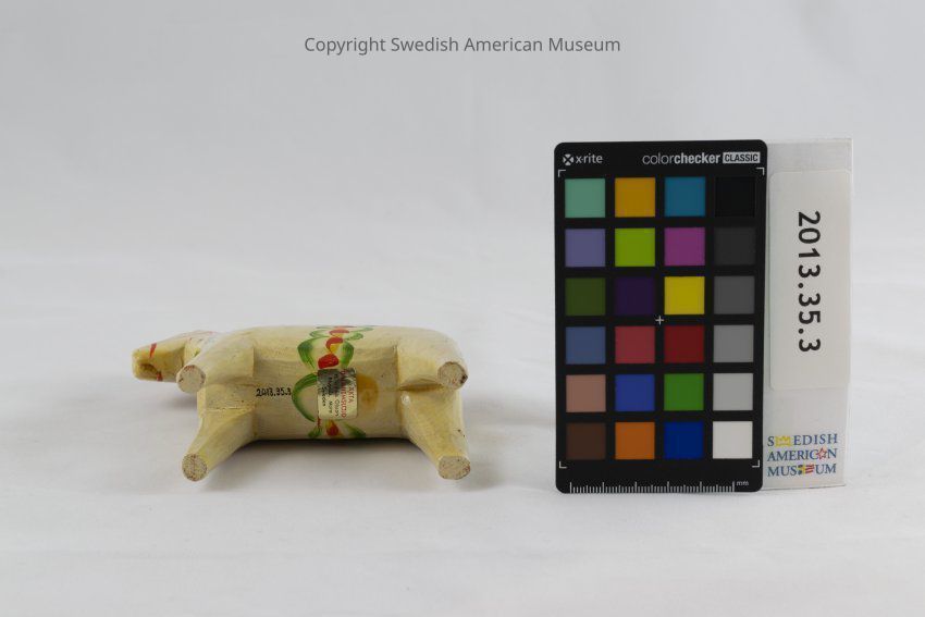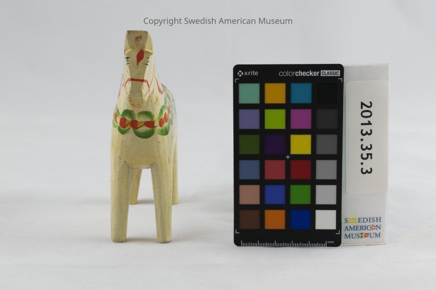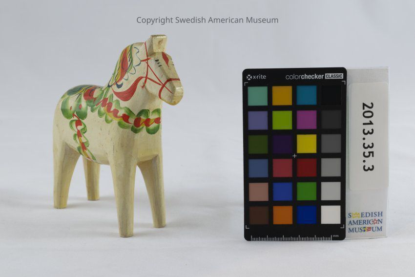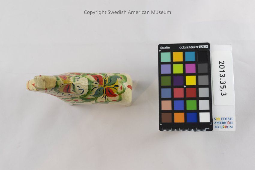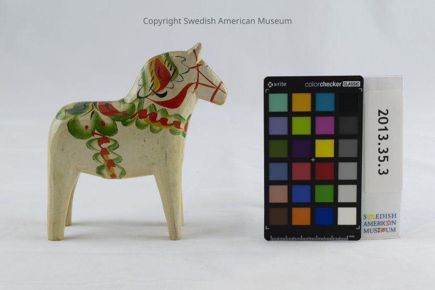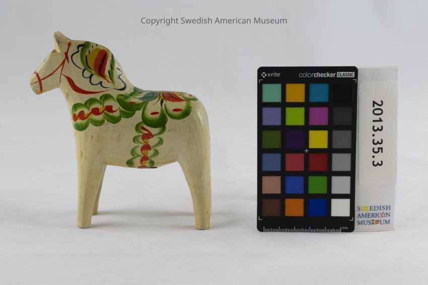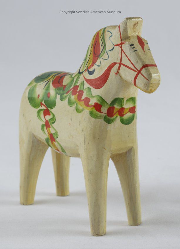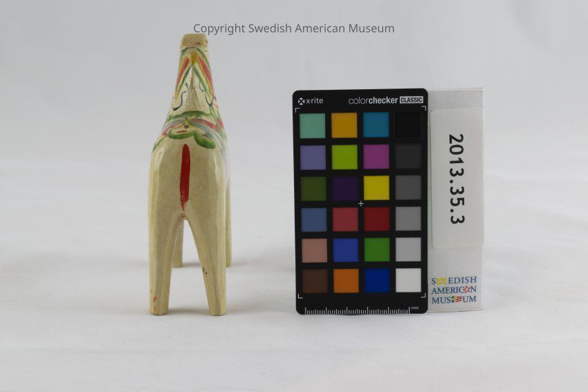 Off-white wooden Dala horse figurine (Dalahäst) accented with red-orange, green, yellow, blue-black, and possibly black throughout. On the horse's back is a painted saddle decorated as a yellow, blue-gray, and orange flower. The saddle's flower looks similar to a butterfly. Its harness and tail are painted with orange. Its mane is painted with green, yellow, orange, blue, and black. On the underside of its belly is a golden sticker that reads in Swedish "Äkta Dalahemslöjd" (Akta Dalahemslojd) in red ink and "tillv. Nils Olsson, Nusnäs, Mora, Sweden" (tillv. Nils Olsson, Nusnas, Mora, Sweden) in black ink.Acquisition