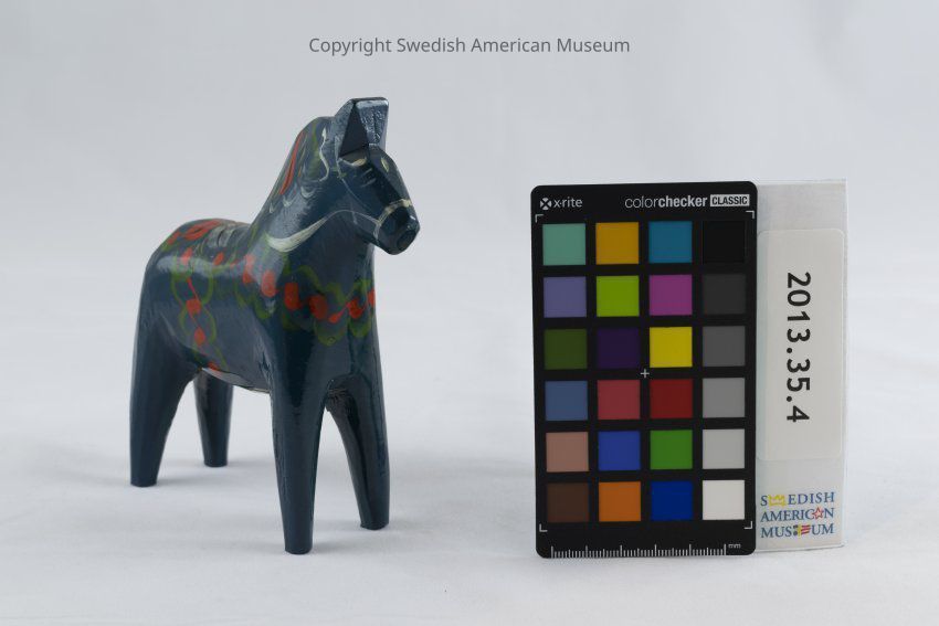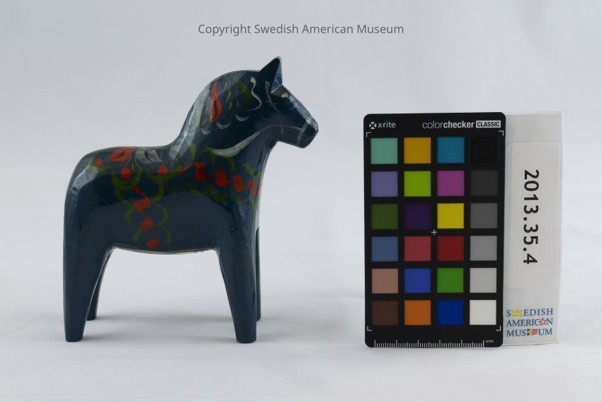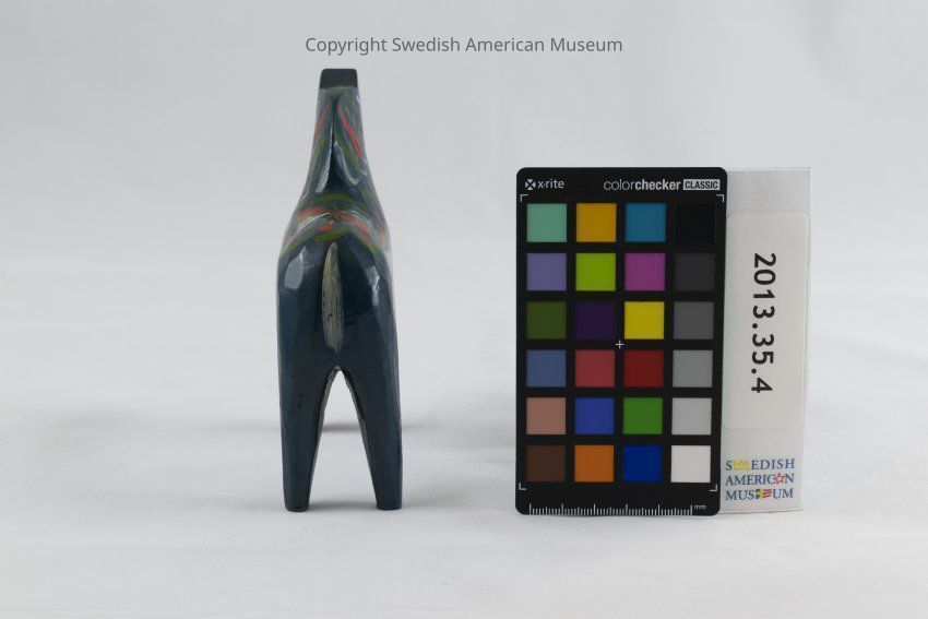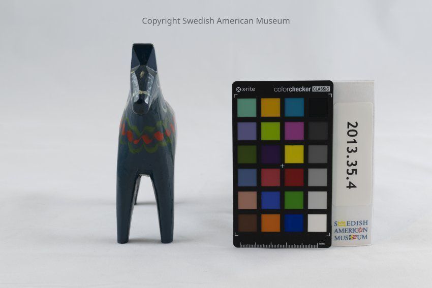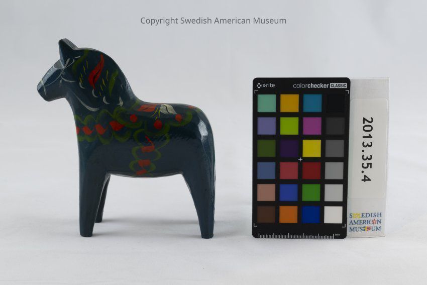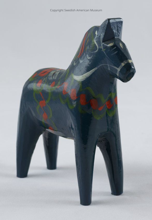 A dark blue wooden Dala horse figurine (Dalahäst) accented with red-orange, green, white, yellow, and black. Its saddle is decorated as a four petal white, red, and yellow flower. The saddle has a green border decorated with red berry-like circles or flowers. The saddle straps are curly red and green lines. The horse's mane consists of white, green, red, yellow, and black. Its harness, tail, and eyes are painted white.Acquisition