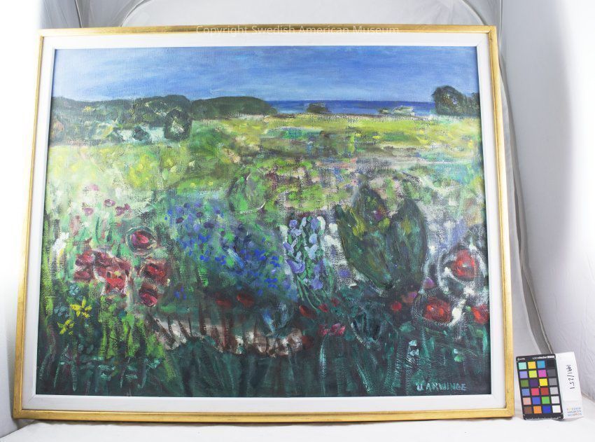 Oil painting of a landscape, in a loose, stylized manner. In the foreground are flowers, in the midground is a meadow, and in the background is the Baltic Sea. Signed, "U. Arwinge," in the lower right corner. On the top of the back of the frame, a strip of masking tape bears the title, and another reads, "Konstnär Ulla Arwinge - Tunaby," with a phone number.Type of Painting