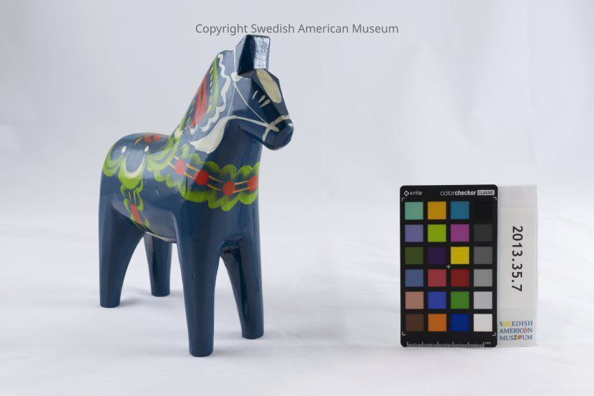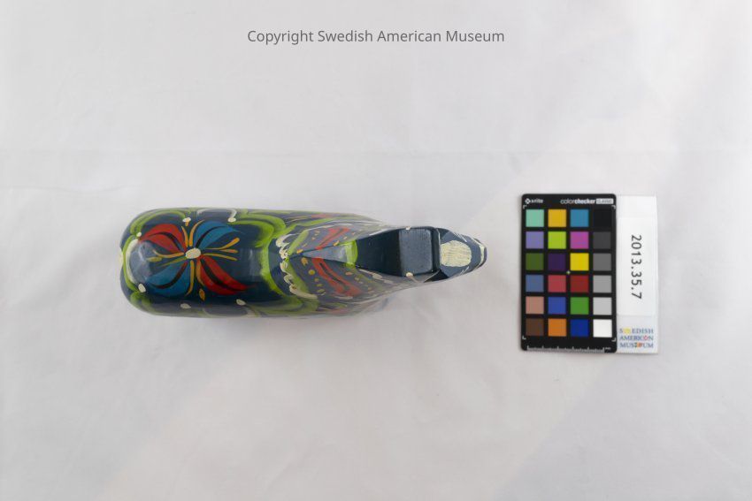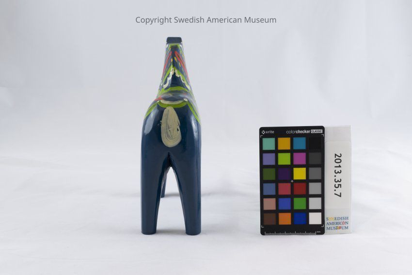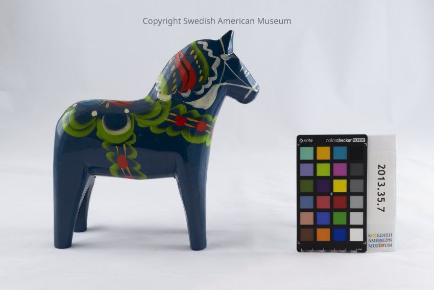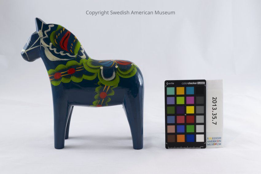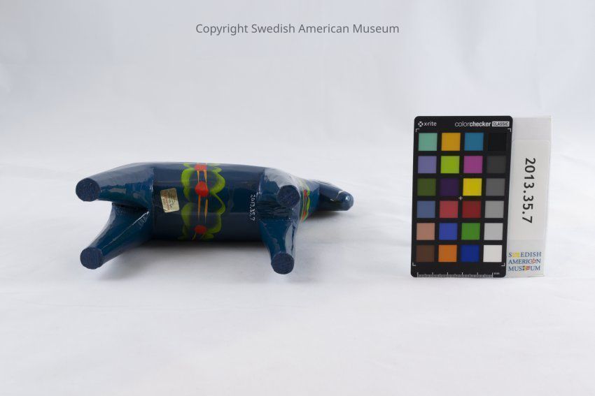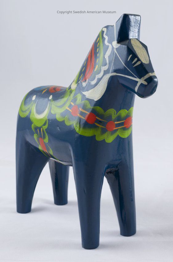 Blue painted Dala horse with a largely blue saddle decorated with two red, white, blue, orange, green, and dark blue butterfly-like structures, red poppy-like flowers, white half-moon shapes, tiny orange lines, and green curving lines.Acquisition