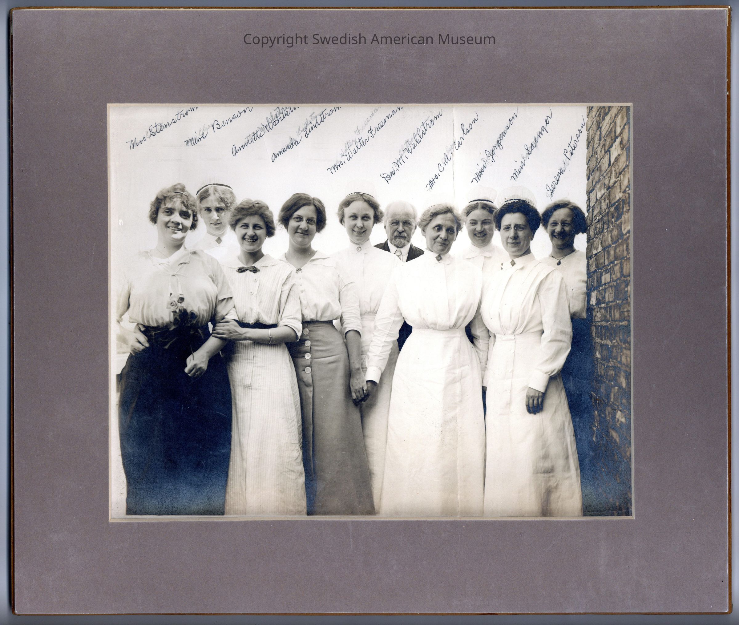 Black-and-white photograph of women nurses: Mrs. Stenstrom, Miss Benson, Annette Wahlstrom, Amanda Lindstrom, Mrs. Walter Freeman, Mrs. C.A. Carlson, Miss Jorgenson, Miss Saenger, Serena Peterson, and Dr. M. Wahlstrom. The women may be nursing instructors.Photograph Details