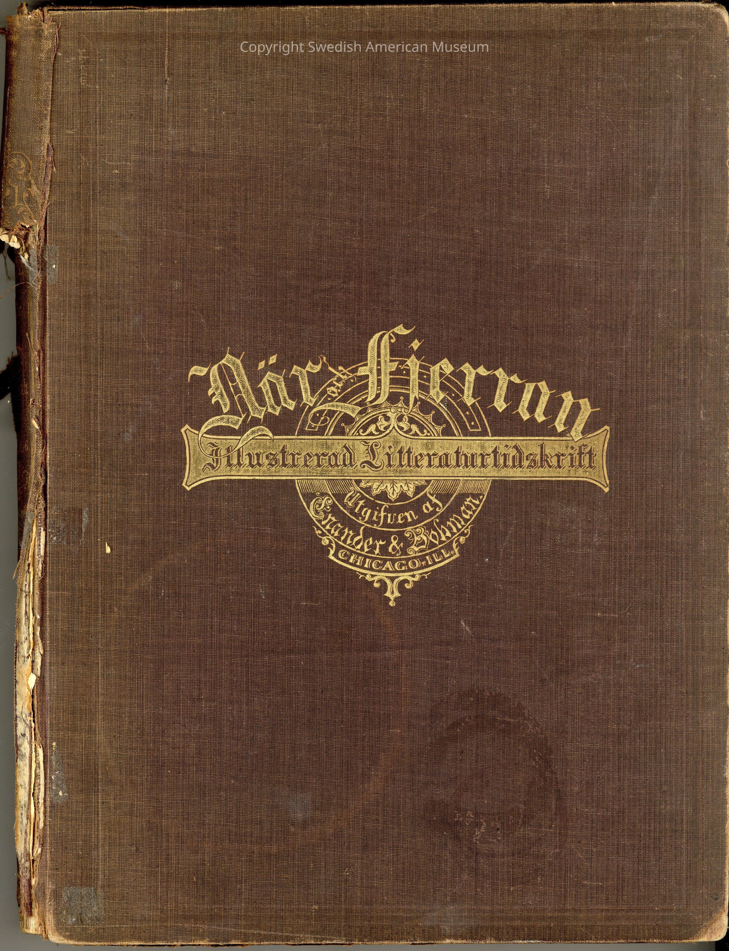 Brown-covered 1874-1875 compilation of a monthly journal published in Chicago in the Swedish language entitled "När och Fjerran: Illustrerad Litteraturtidskrift." The subjects are varied, including religious subjects, local Chicago subjects, poetry and literature. It includes many illustrations, including one of a Swedish stuga interior.Acquisition