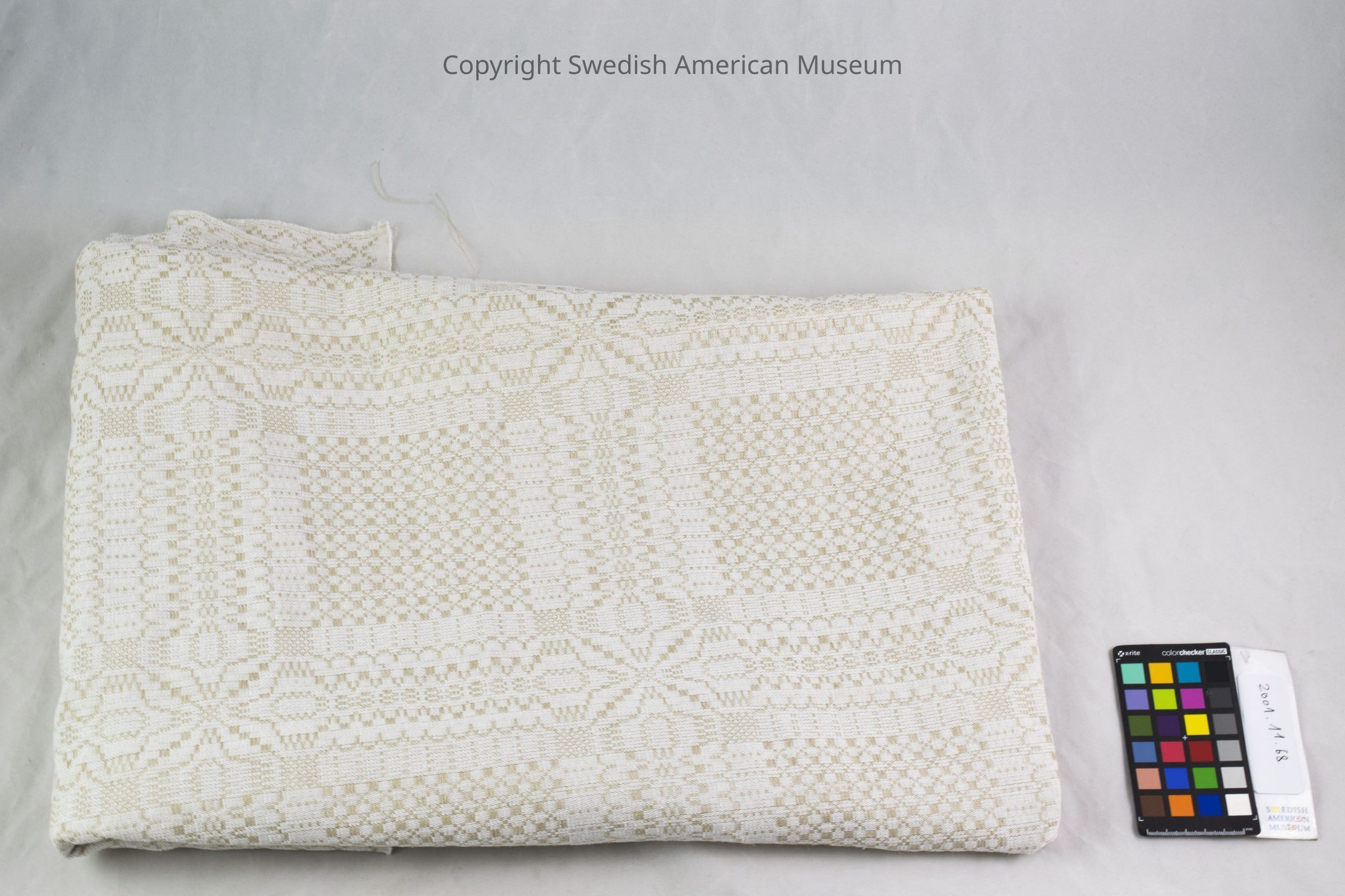 Two white table linens with beige patterns. The decorations include flowers, buildings, figures, straight lines, slanted lines, semi-circles, and curves.Acquisition