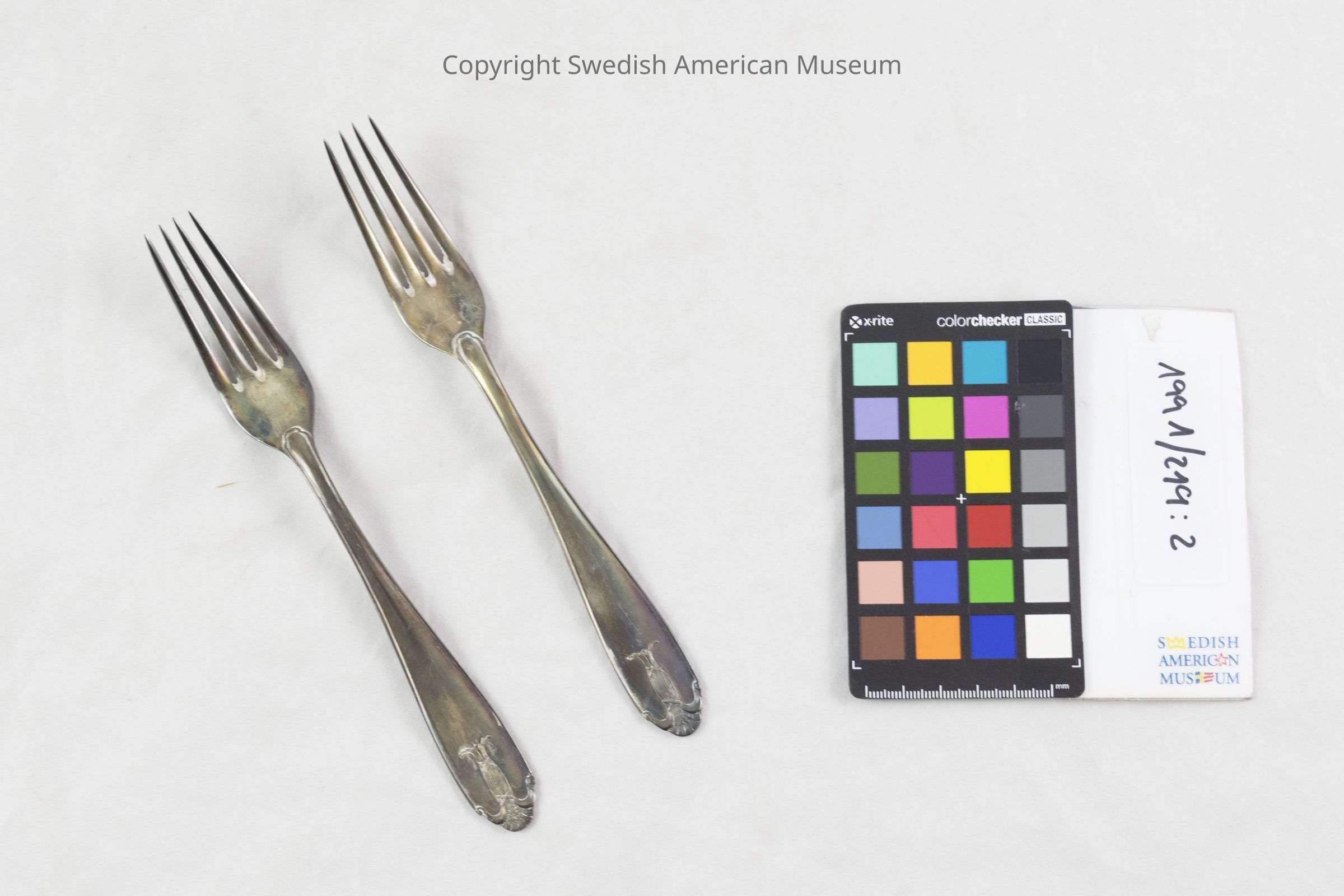 Six, long, four-pronged silver-plated dinner forks, with initials "A.A".Acquisition