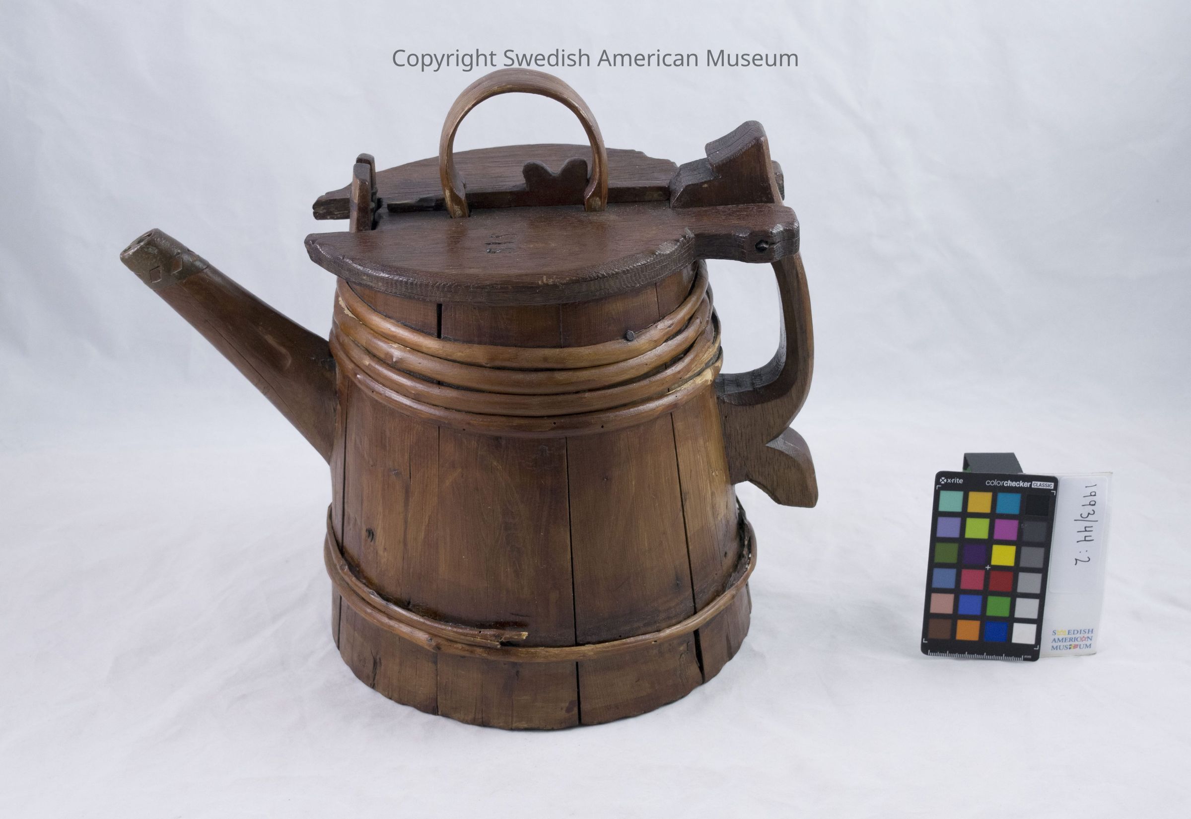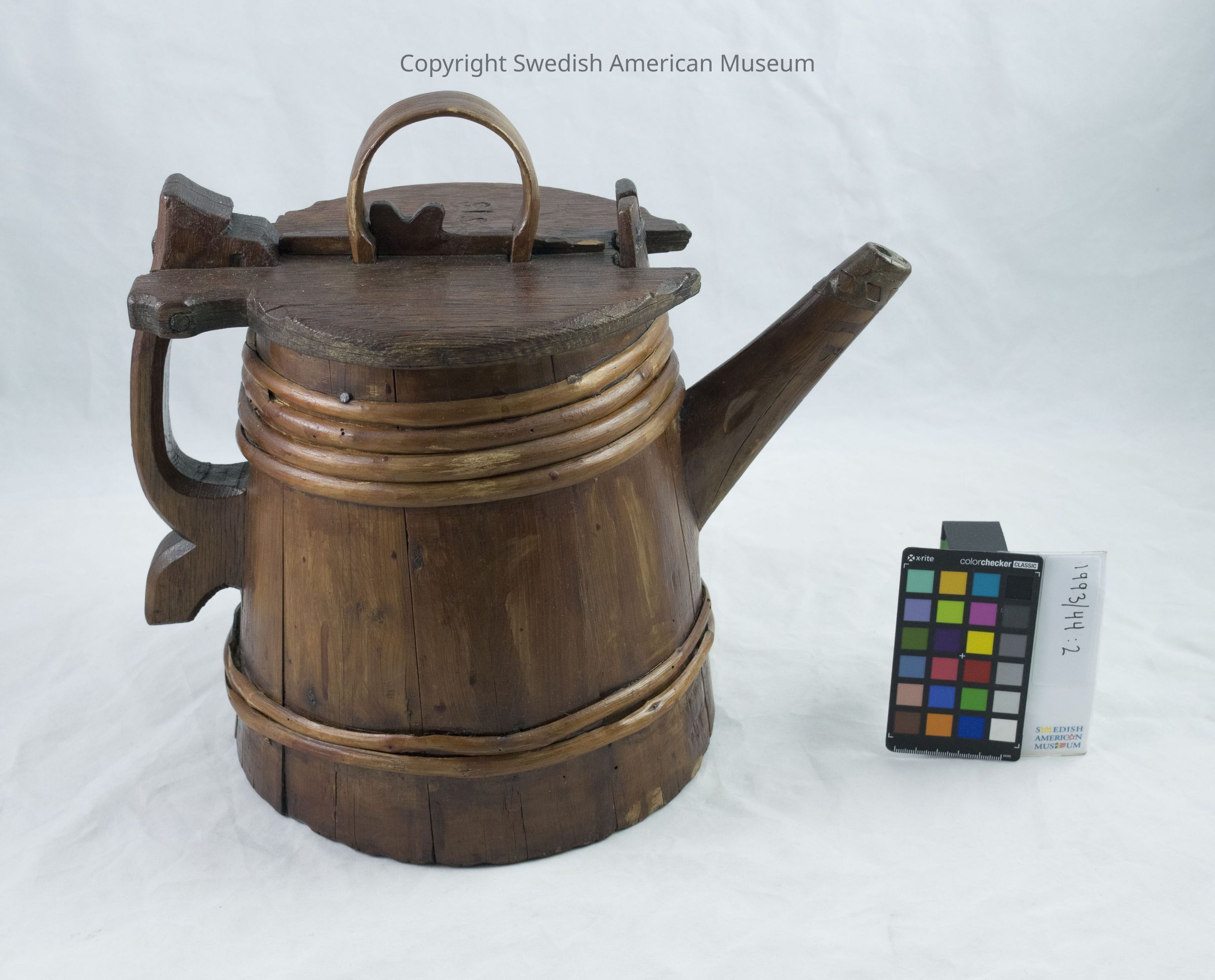 Round wooden coffee pot with attached lid, spout, handle and locking mechanism on lid handle. Spout has metal tip.