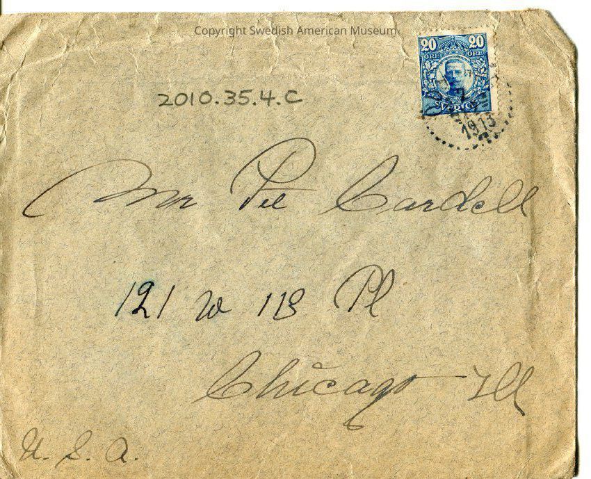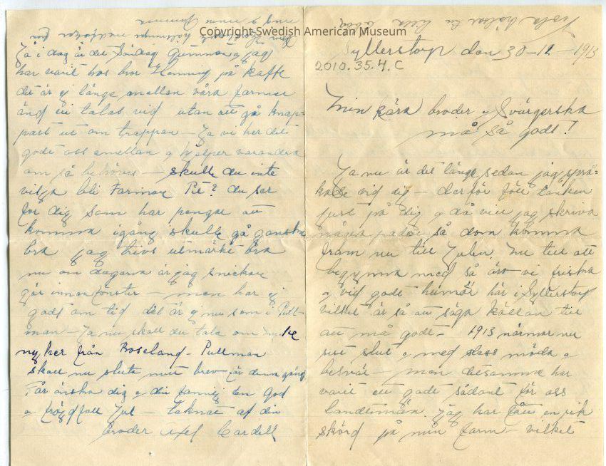 Letter written Dec. 30, 1913, to Per Cardell from his brother Axel Cardell. Axel talks about his daily life on his farm in Sweden and how he hired a farmworker to be able to spend more time with his family. He also mentions an estate inventory done on Eriksboda, how much the farm was worth and that their father bought the farm Eriksboda.Subject