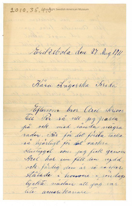 Letter written Aug. 24, 1911, to Mr. Per Cardell's wife Frida Cardell from her sister in-law Maria (Larsson). In this letter Maria is asking Frida to tell Per that he should write to his brothers in Sweden and tell them that there is no work in America. She is writing that her brothers have "the America-fever".Subject Place