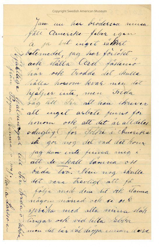 Maria Larsson writes: “My brothers have America fever and of course I do not know about a cure... Frida, do you think that you could tell Per to write to Axel and tell him there is no work for him and it is hard for people in America?”Acquisition