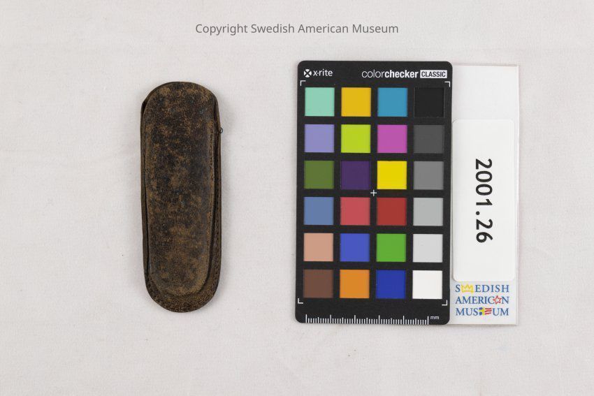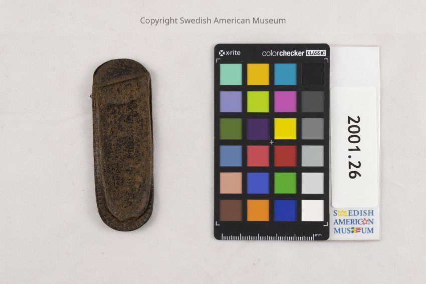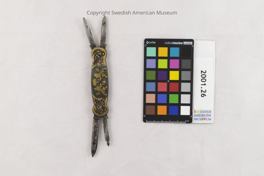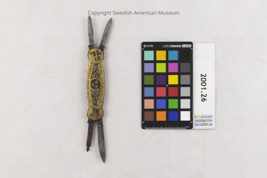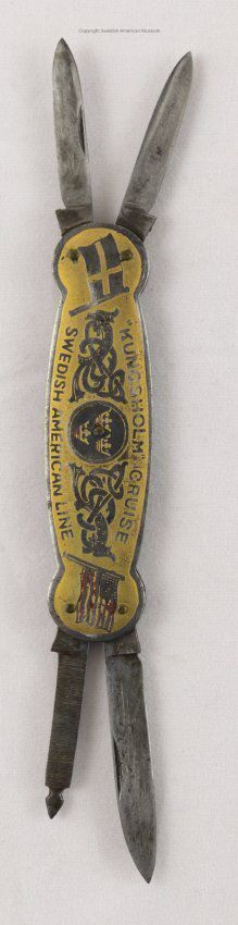 Metal knife with the inscription, "Kungsholm Cruise Swedish American Line." On the front are illustrations of the American flag, the Swedish flag, two snake-like figures, and a circle with three crowns. These prints are on a golden background. On the back are illustrations of two bird-like figures on a golden background and two golden horse-like figures on a black background.Context