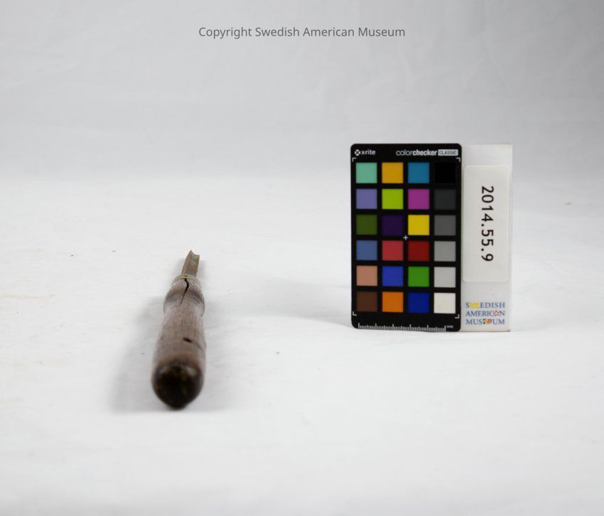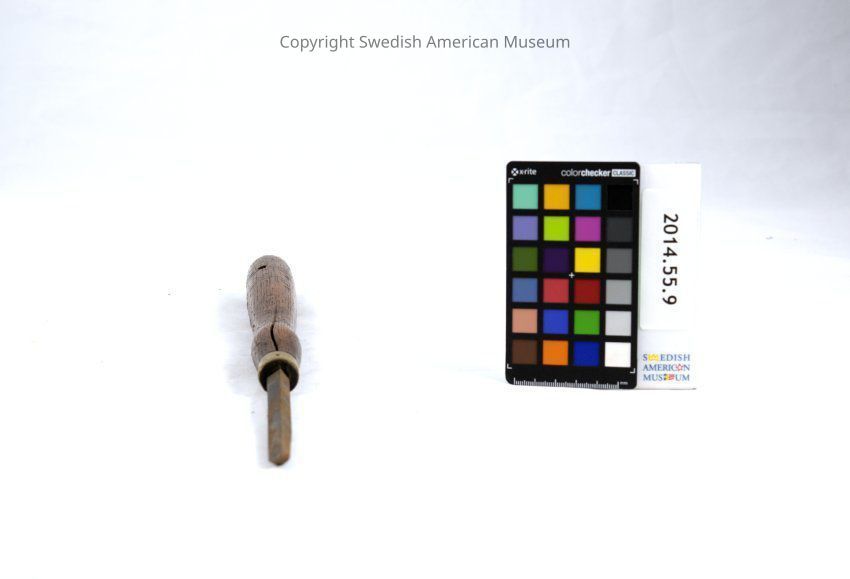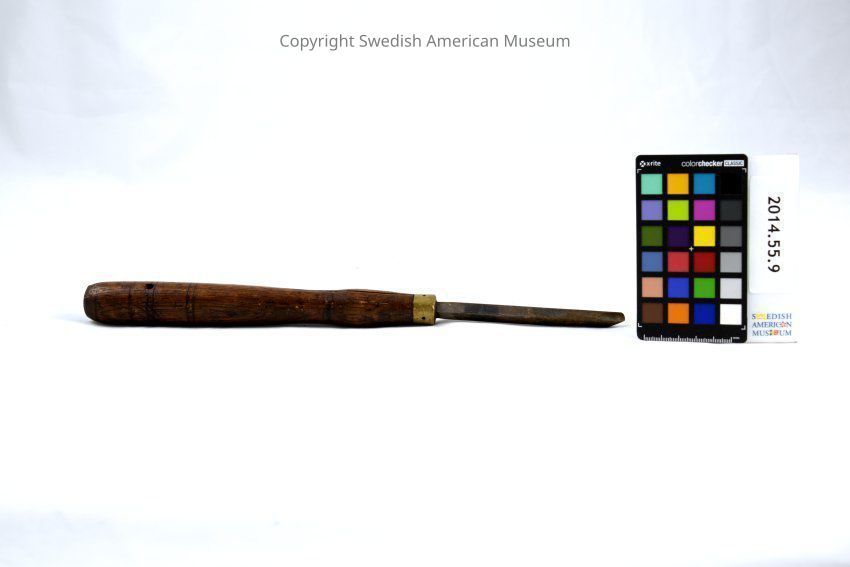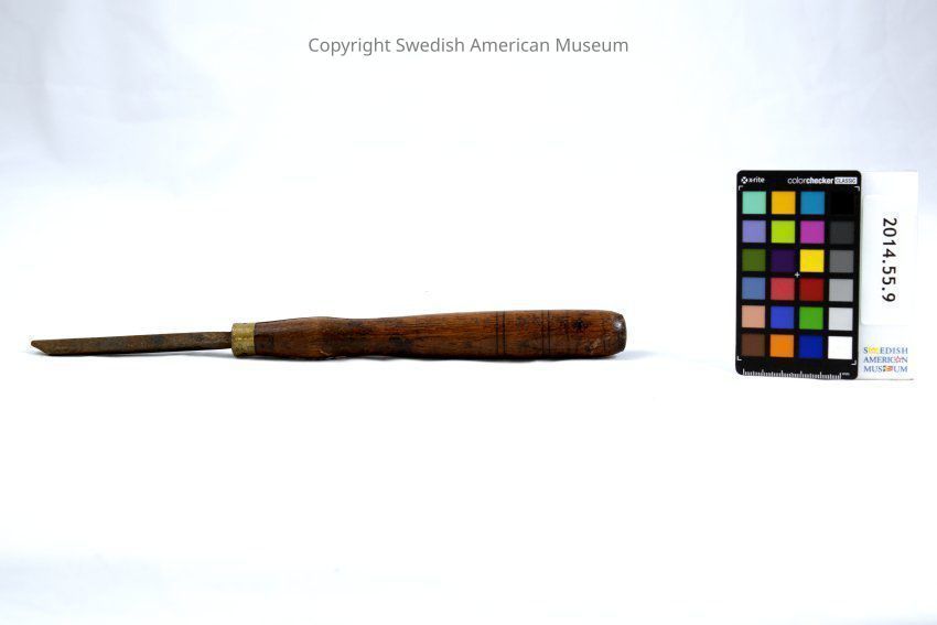 Woodworking tool shaped somewhat like a screwdriver. It has a main section that is brown, wooden, and rounded with the upper and lower parts extending outward more than the middle part and a brass-colored upper end. The upper section is bar-shaped, bronze-colored, and metallic and it gradually reaches higher as it goes from the back to the front.Acquisition