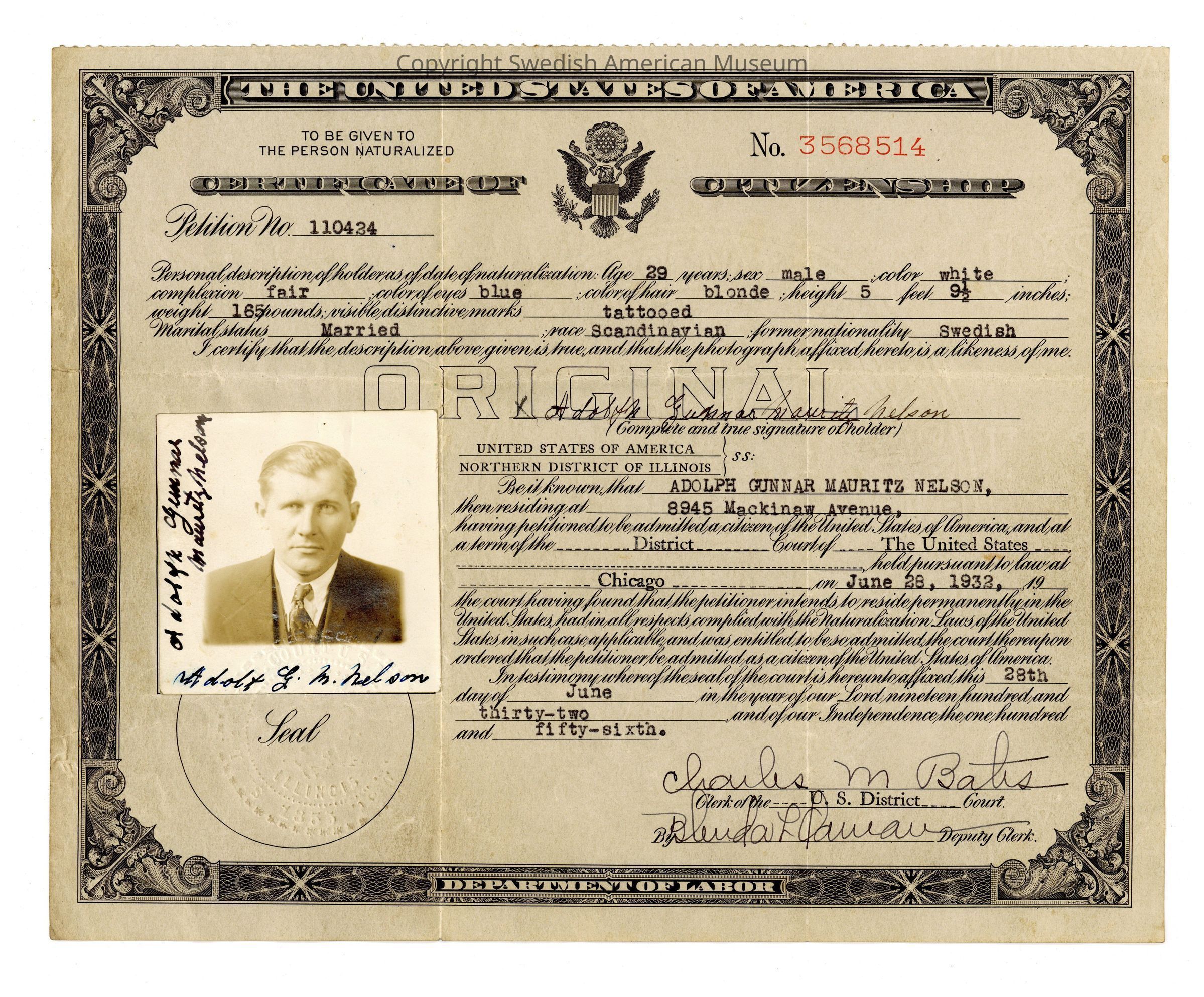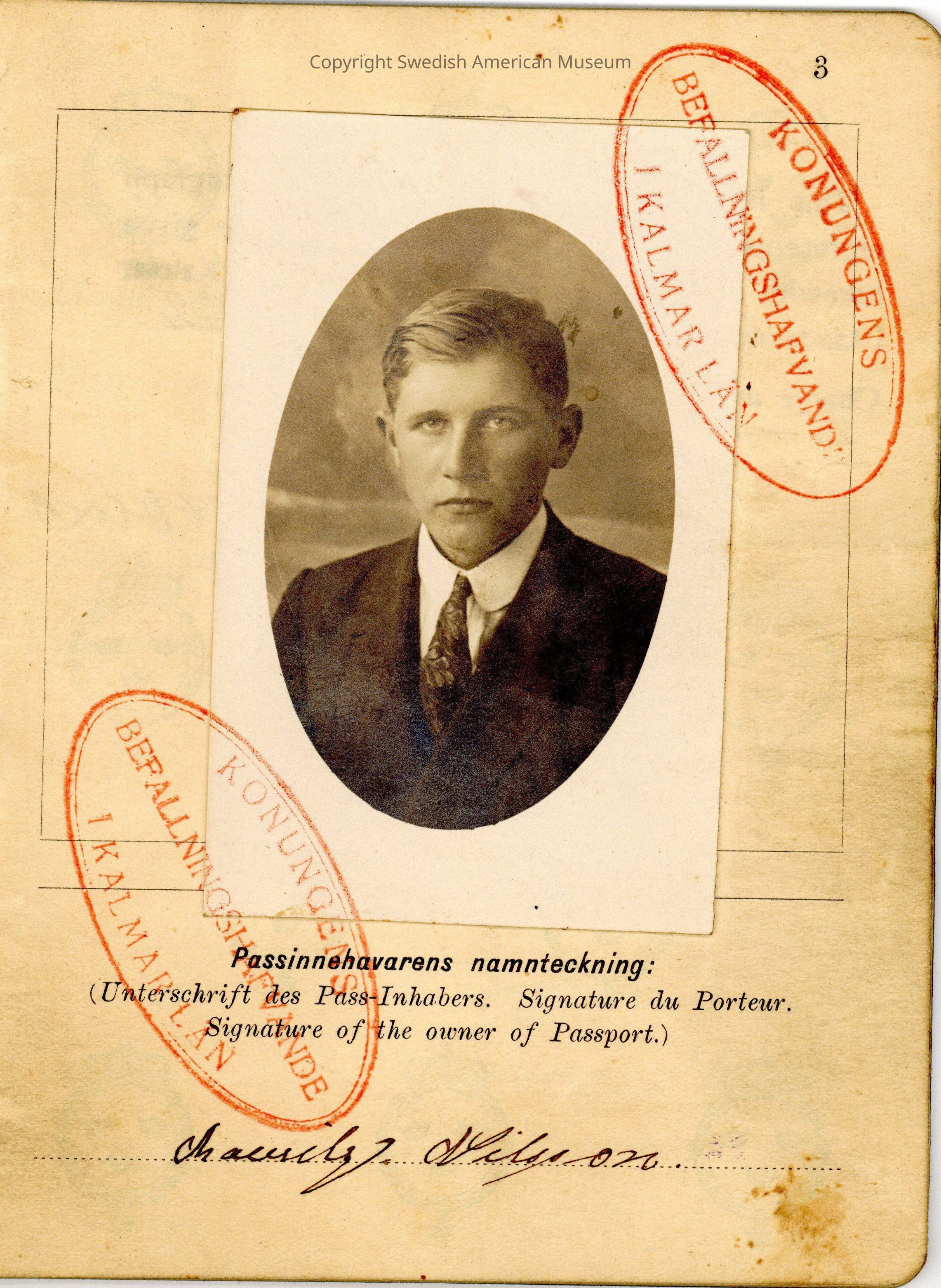 Adolph Gunnar Mauritz Nilssen was born in the Föra parish of the Kalmar Province on September 22, 1902. As a young man in Sweden, he was conscripted into military service and worked as a sailor. In September 1922, he immigrated to the United States via the Swedish American Line on the ship the SS Drottingholm. It is possible he was brought over by a relative or someone with a connection to his home; he is vouched for by an Oscar Peterson in a July 1922 letter recommending him for immigration, and his home in Duluth, Minnesota is listed as Nilssen's future place of residence. Nilssen lived in Duluth for several years, at one point working for the Minnesota Steel Company.