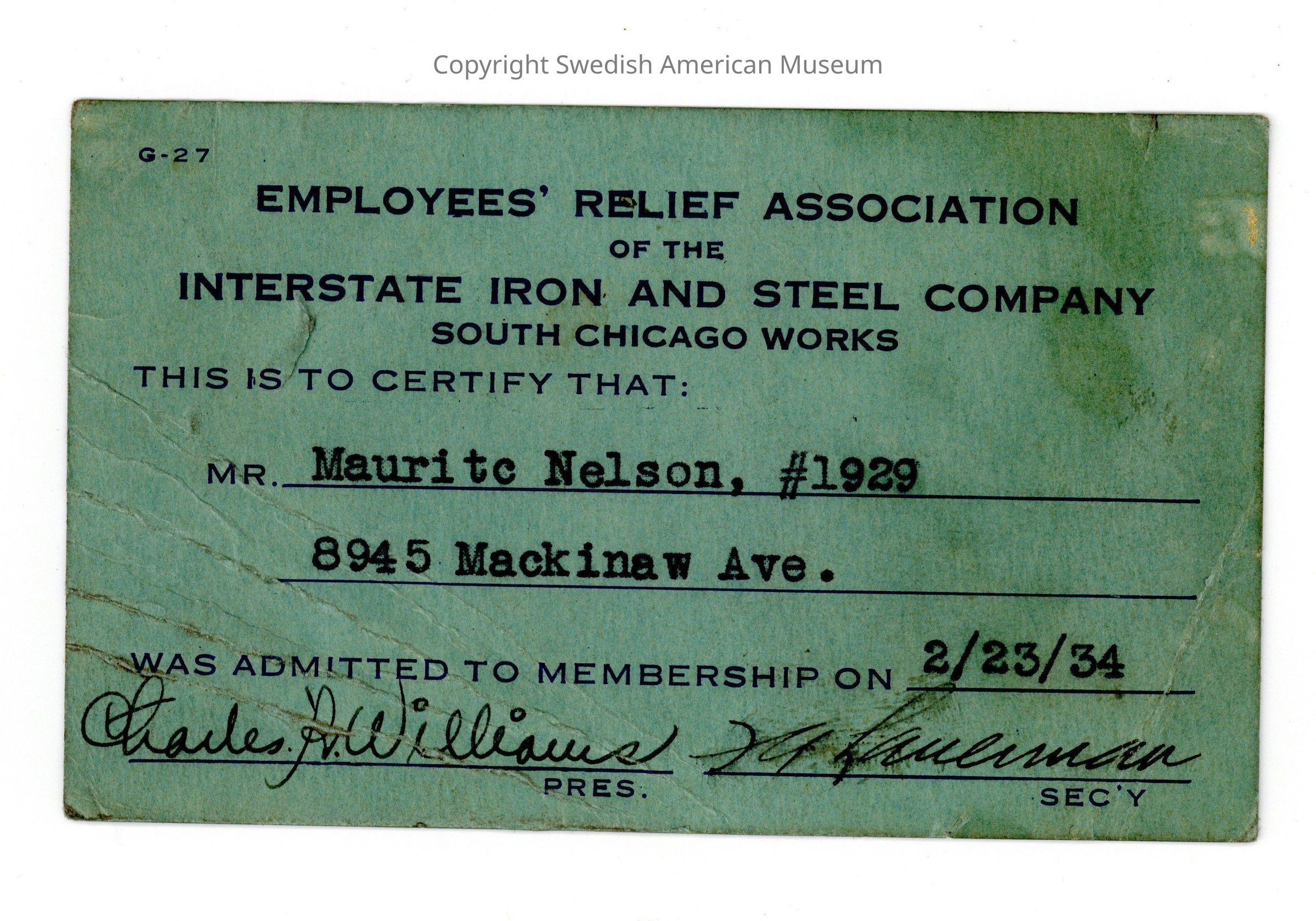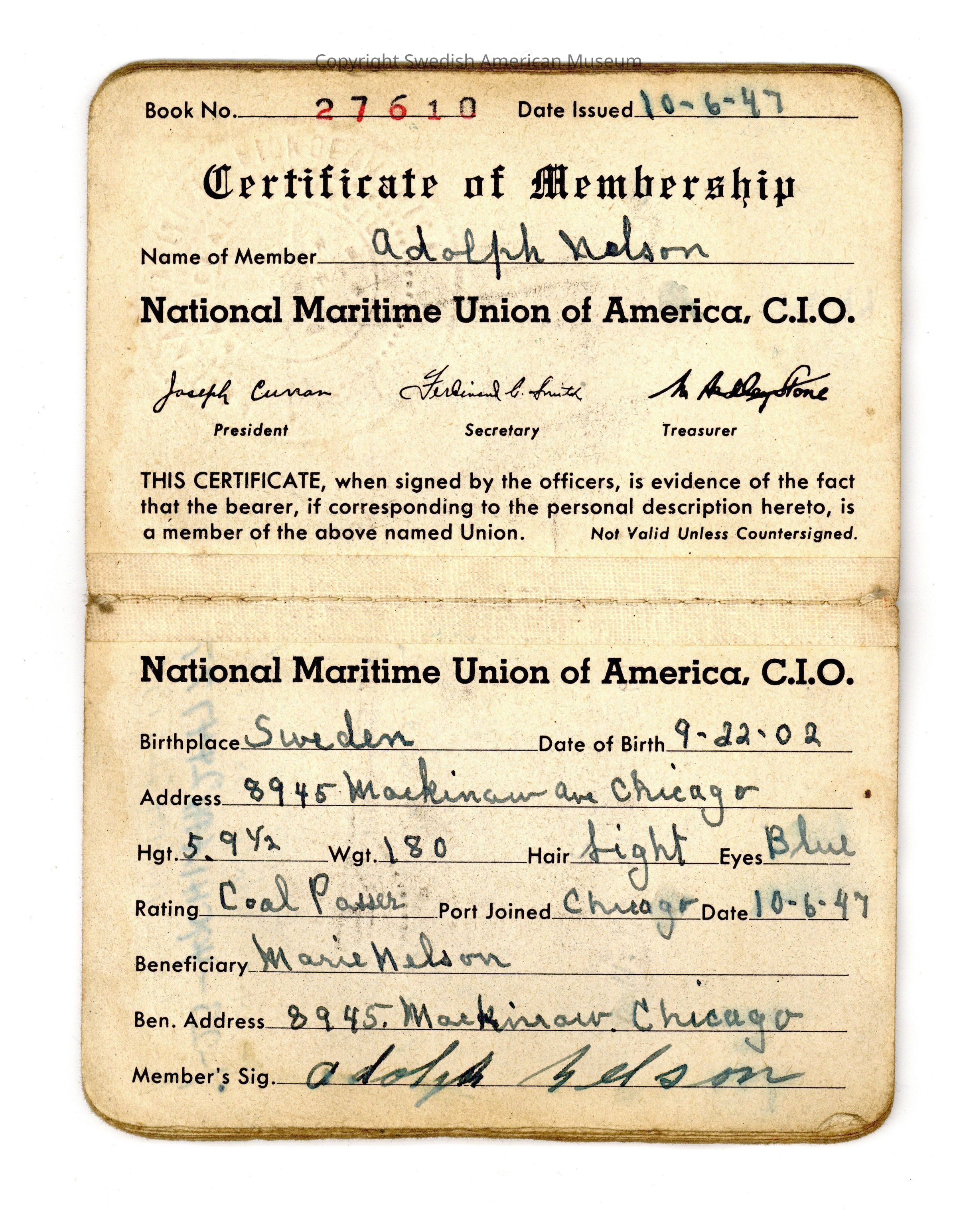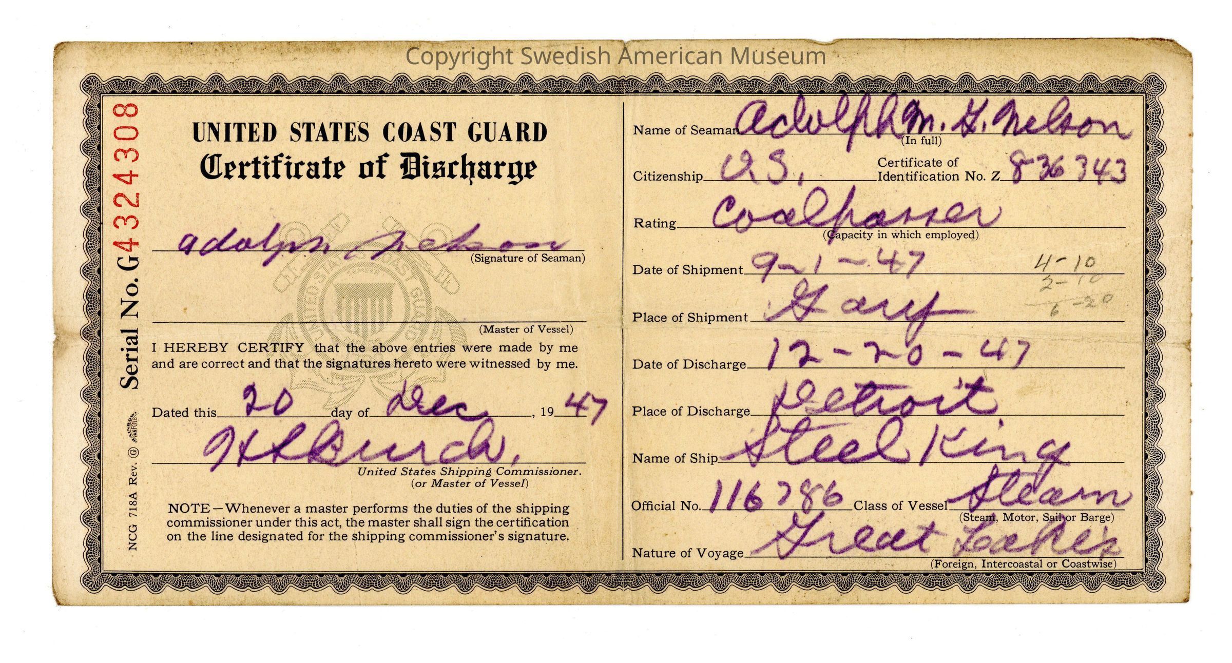 It seems as though Nilssen continued to live in the South Shore with his wife (and possibly his adult stepchildren) throughout the 1940s and early 1950s. He returned to his roots as a sailor during this time and worked in the U.S. Coast Guard and the Great Lakes shipping industry. Discharge documents from the Coast Guard list him working as a coal-passer, fireman, ordinary seaman, and wiper during various voyages around the Great Lakes. He was also a member of the U.S. Maritime Union.