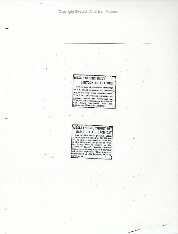 Xerox copy of advertisement for radio station W.I.B.O. and television station W9XAO.Context