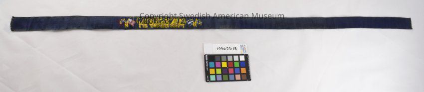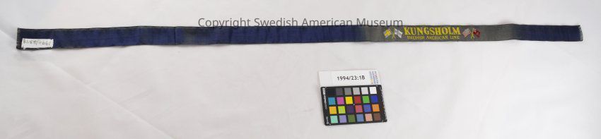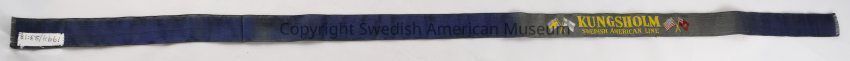 Swedish American Line ribbon from a ship's gift shop. Blue satin ribbon with yellow embroidery featuring the Swedish, Finnish, American and Norwegian flags and the word "Kungsholm".Context