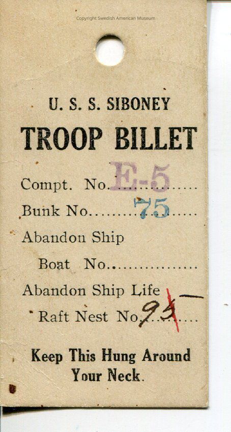 Troop billet for Thor Rydholm for lodgings onboard the naval ship U.S.S. Siboney during World War II. The billet indicates his compartment and bunk number.