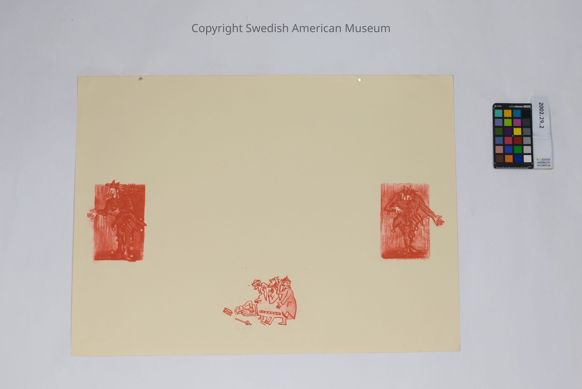 Lithograph by Jordi Arkö on two sides entitled "Hemma och i Österled #10" (Home and Eastwards). One side depicts two men playing white horns surrounded by many figures, including a man playing drums, figures playing trumpets and French Horn-like instruments, a figure standing upside down, and many more who are performing acrobatics of all sorts. The other side consists of six figures in red, two of them are dressed as jesters.Type of Print